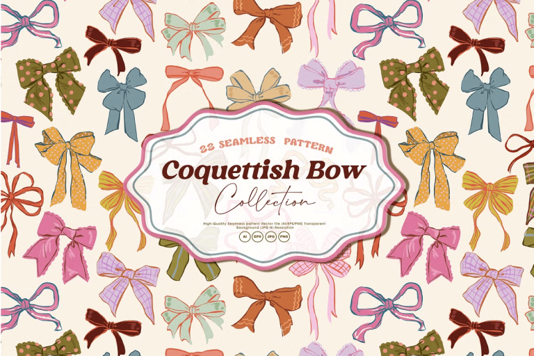 Elevate Your Projects with Delicate, Playful Charm Unleash the allure of vintage elegance with the Coquettish Bows Seamless Pattern Collection—a hand-drawn tribute to feminine charm. Each design captures the soft, flirtatious spirit of ribbon bows, celebrating the timeless appeal of…