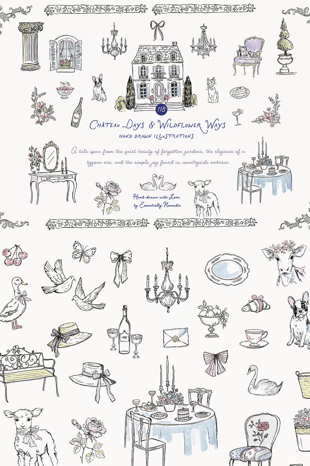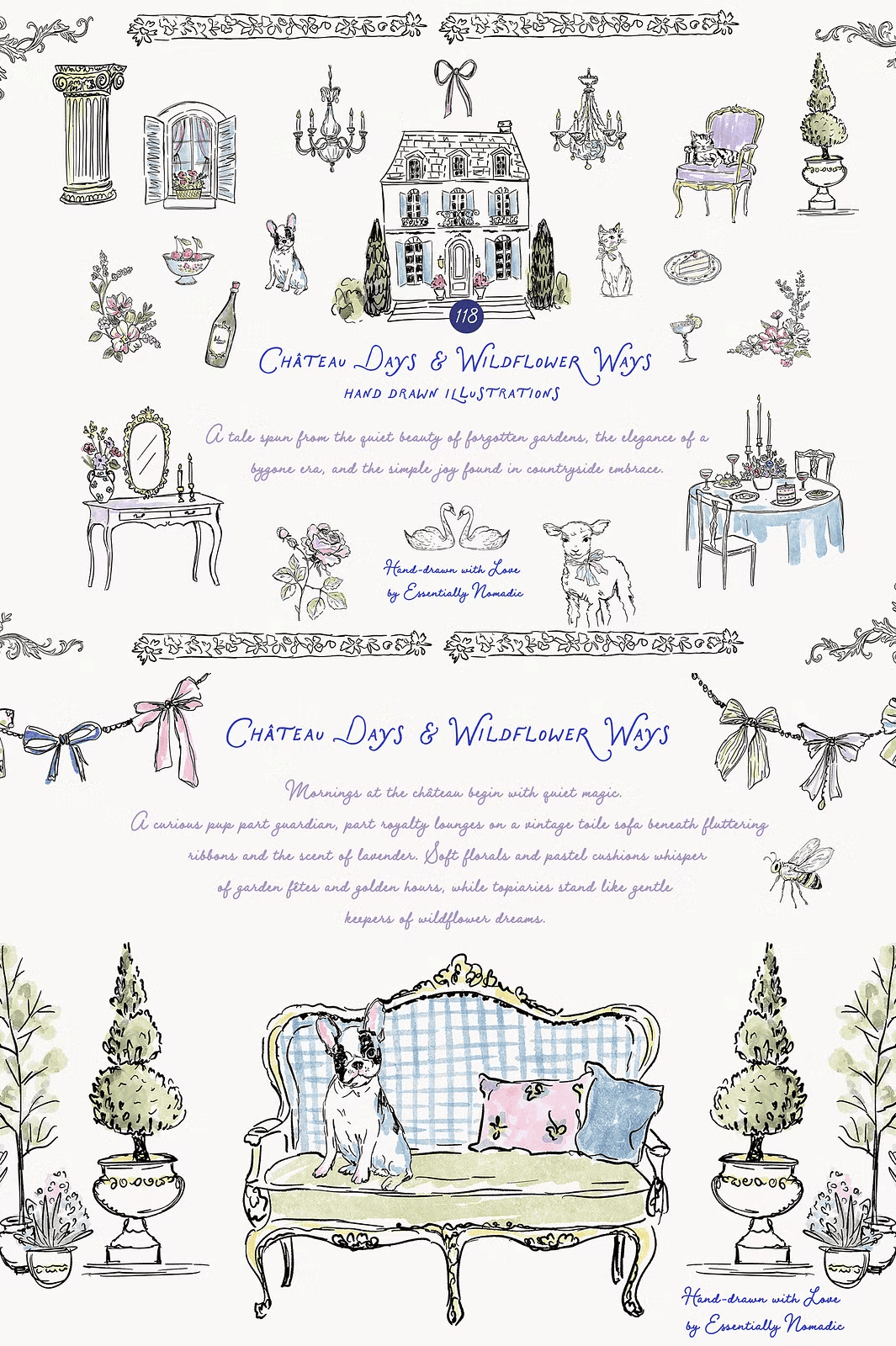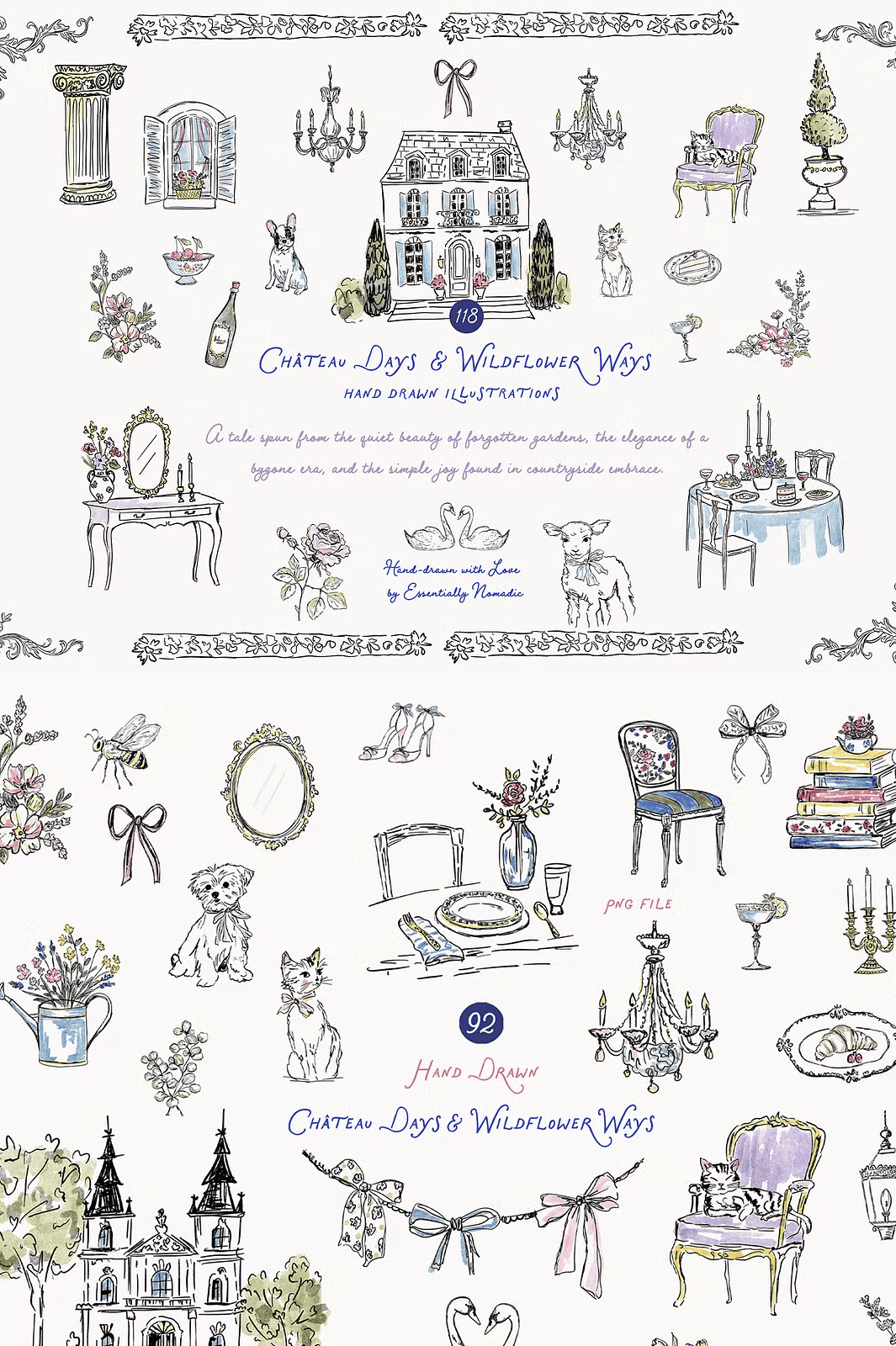 Unwind your creativity with **Château Days & Wildflower Ways**, a meticulously crafted clipart collection that brings the gentle magic of French summer to life. Each illustration is a story in motion — a quiet afternoon under a wisteria-covered pergola, the flutter of ribbons in a breeze, the soft rustle of lavender stems in a sunlit meadow. This isn’t just design imagery. It’s a visual narrative of slow living, handcrafted beauty, and timeless elegance.