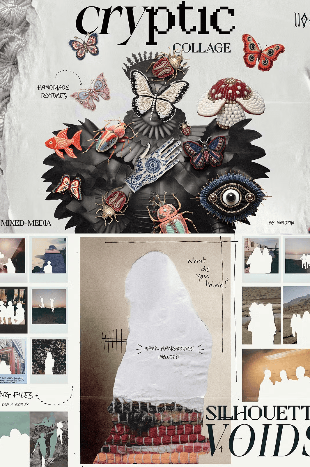 – **10 Premade Compositions (PNG)** – Complete, narrative-driven layouts ready to be used as templates or inspiration. They showcase how fragments can cohere into something haunting and meaningful — a launchpad for your own vision.