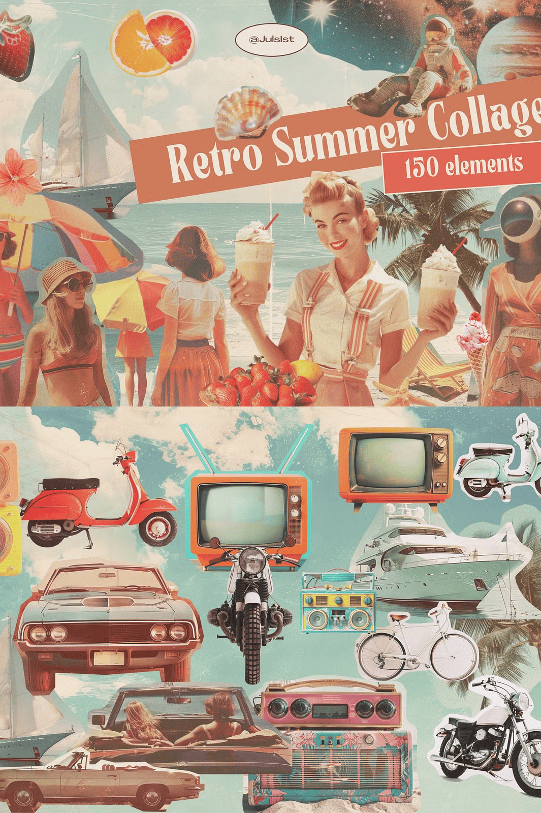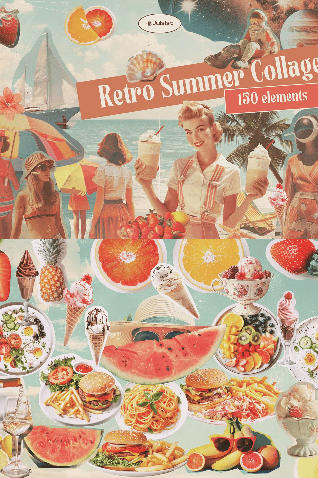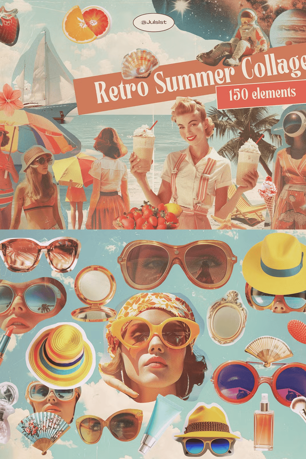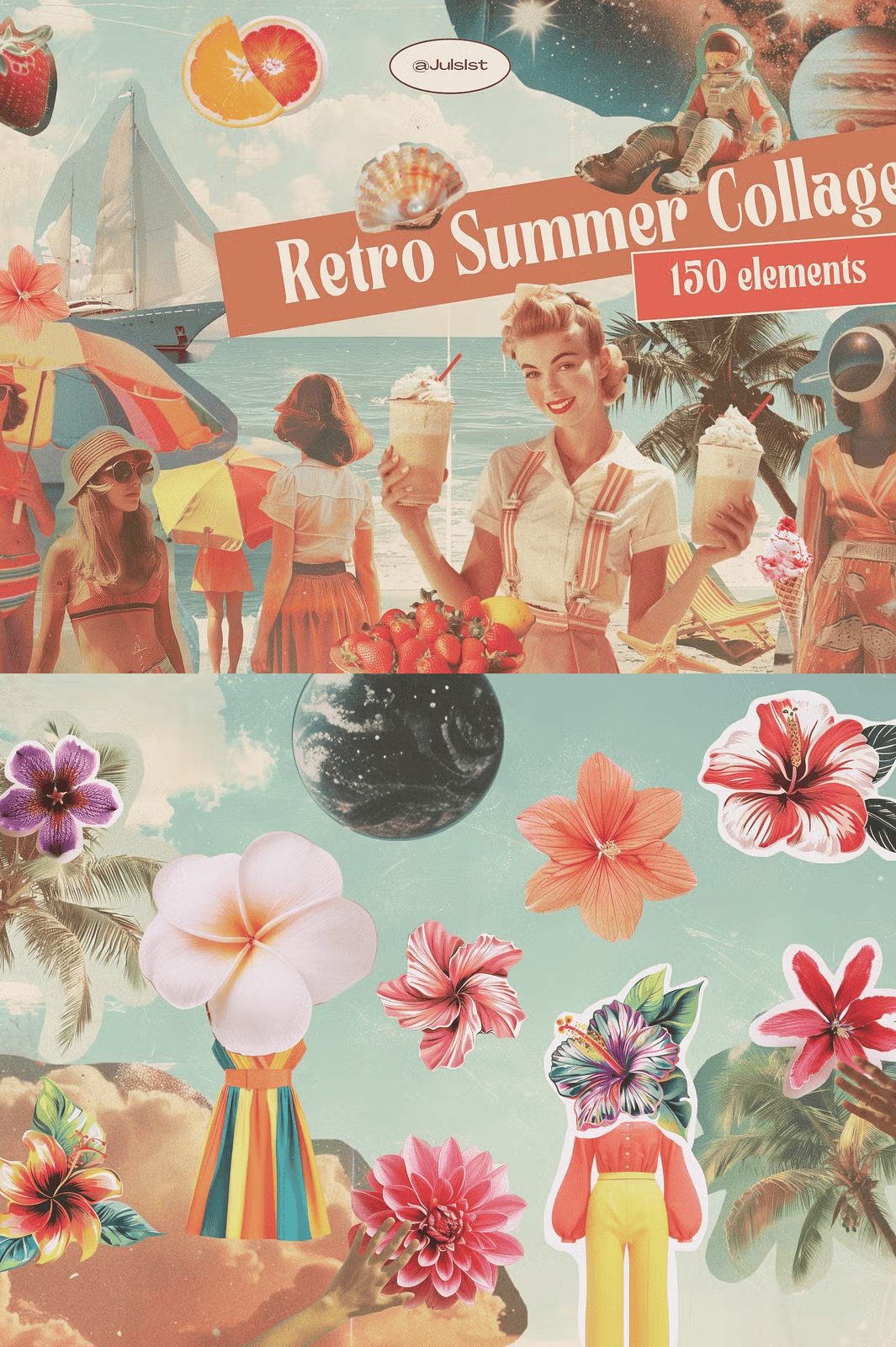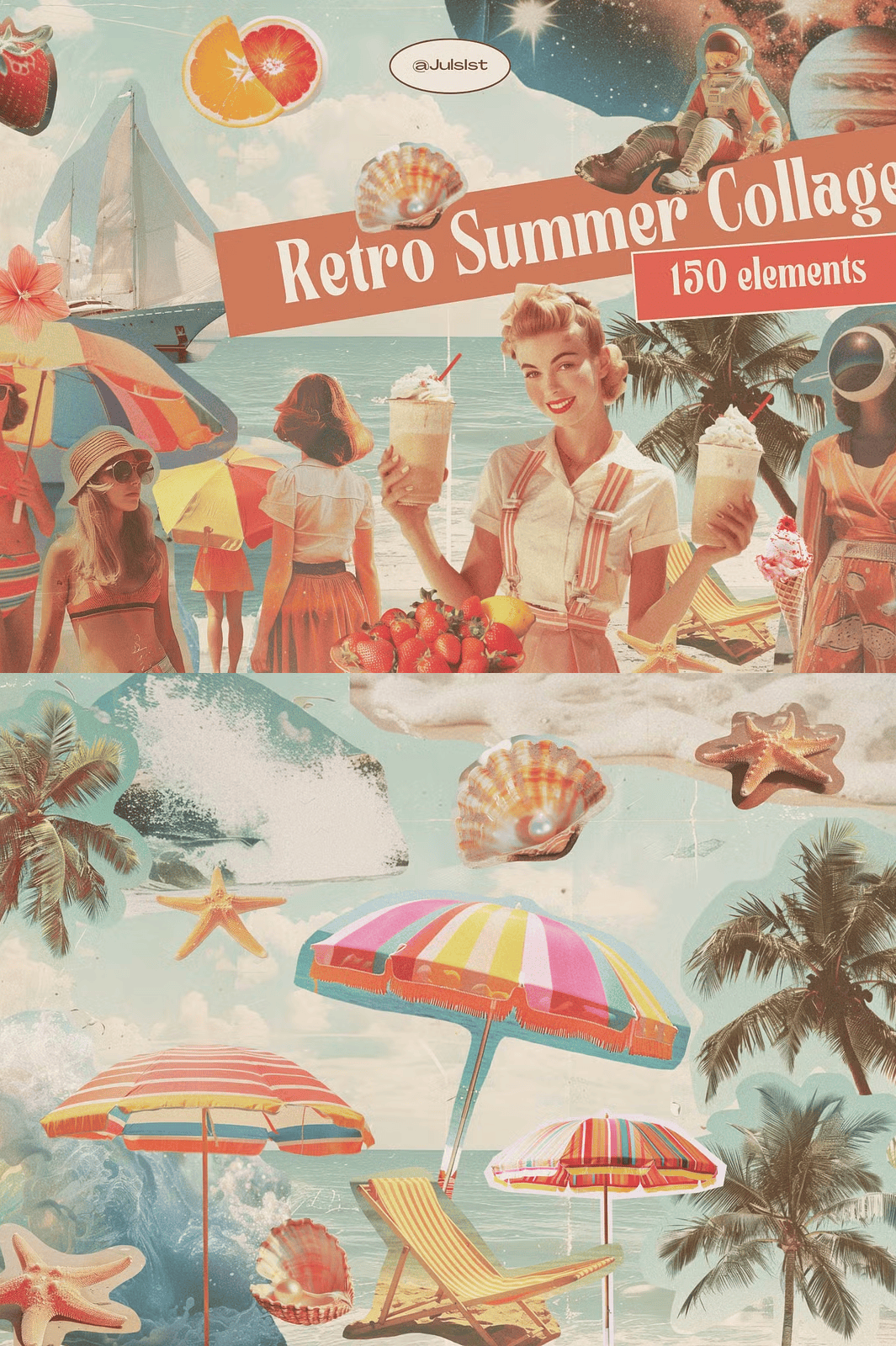 Unleash the spirit of sun-drenched decades past with the **Retro Summer Collage Elements** — a hand-curated collection of **150 high-resolution vintage PNG assets**, each meticulously chosen for visual impact, texture, and storytelling power. Whether you’re crafting vibrant posters, building bold branding, designing social media content, or assembling nostalgic scrapbooks, this bundle eliminates the need to create from scratch and delivers professional-grade results in seconds.
