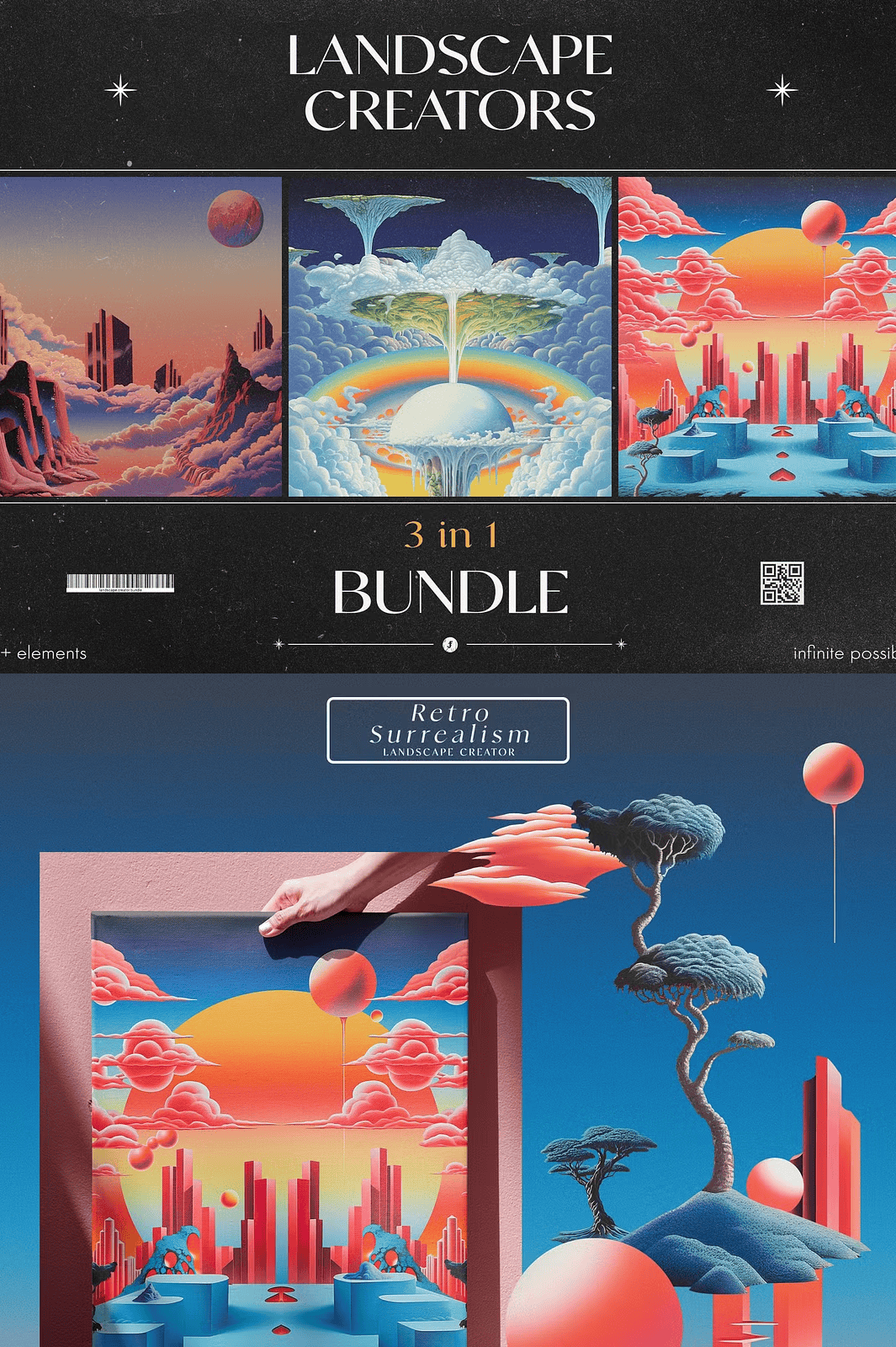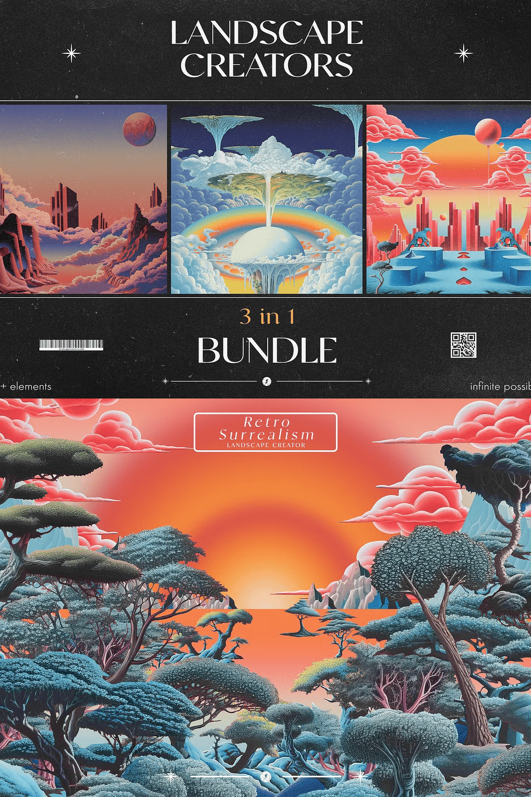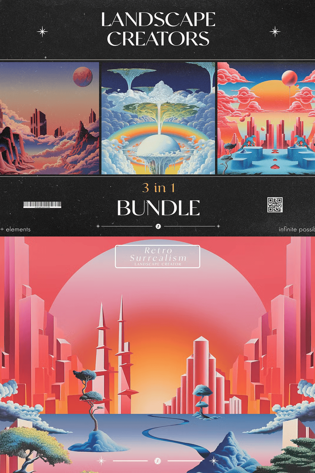 Transform your creative projects with the **3 in 1 Landscape Creators Bundle** — a comprehensive digital toolkit for artists, designers, and visionaries who crave bold, imaginative, and visually mesmerizing landscapes. This all-in-one collection merges three distinct, high-quality packs: **Retro Surrealism Landscape Creator**, **Retro Dream Landscape Creator**, and **Visionary Landscape Creator**. Each pack delivers a unique, immersive aesthetic, empowering you to craft digital scenes that evoke wonder, nostalgia, and surreal depth.
