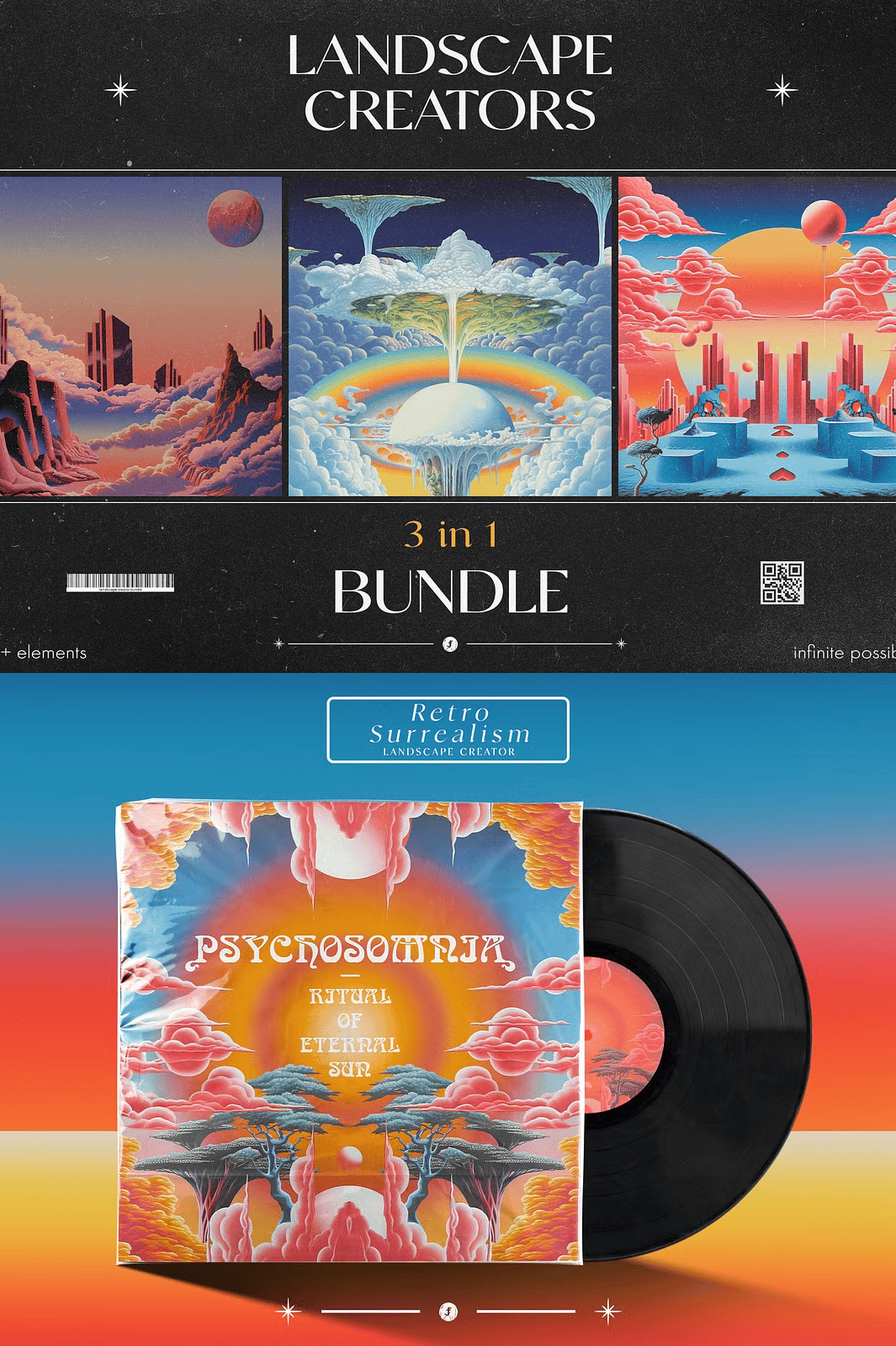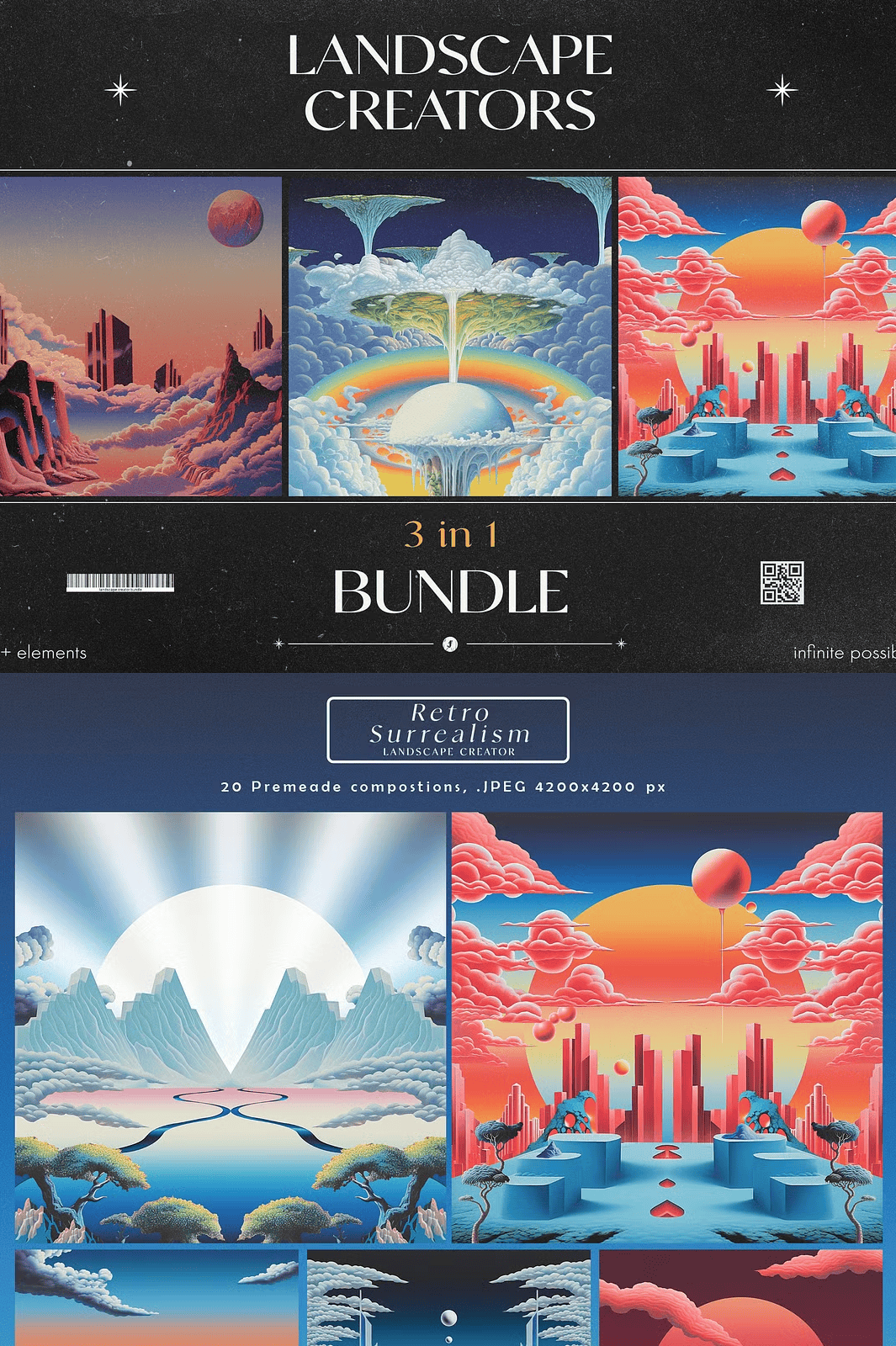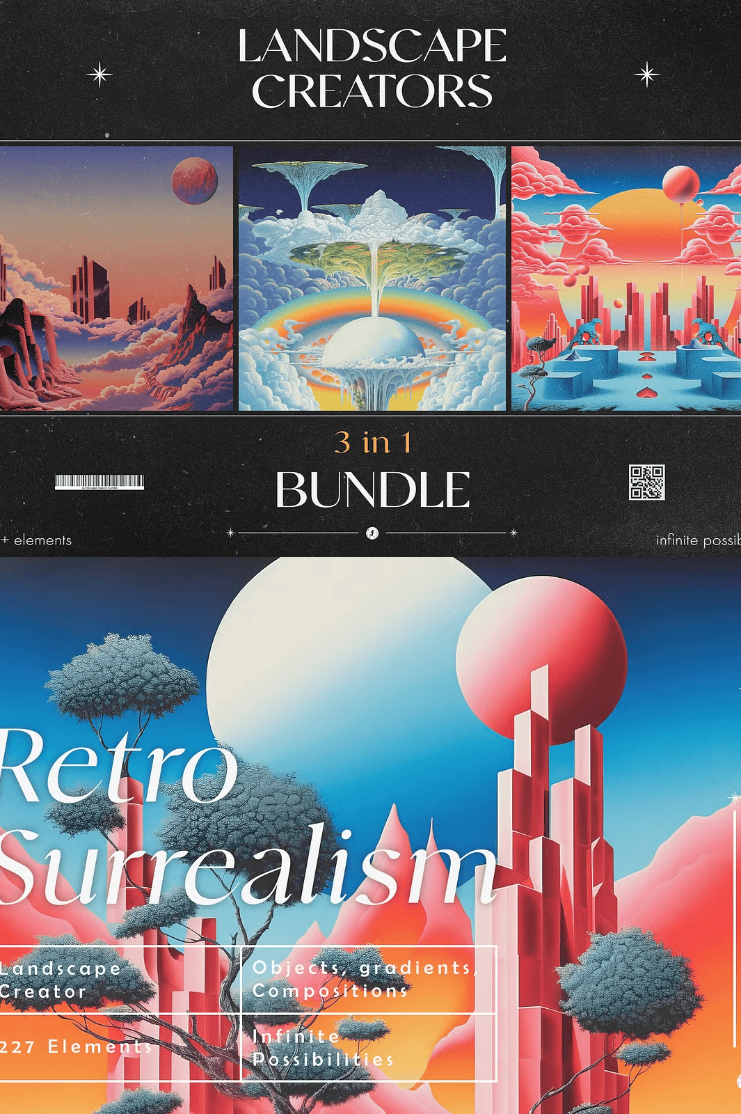 Transform your creative projects with the **3 in 1 Landscape Creators Bundle** — a comprehensive digital toolkit for artists, designers, and visionaries who crave bold, imaginative, and visually mesmerizing landscapes. This all-in-one collection merges three distinct, high-quality packs: **Retro Surrealism Landscape Creator**, **Retro Dream Landscape Creator**, and **Visionary Landscape Creator**. Each pack delivers a unique, immersive aesthetic, empowering you to craft digital scenes that evoke wonder, nostalgia, and surreal depth.