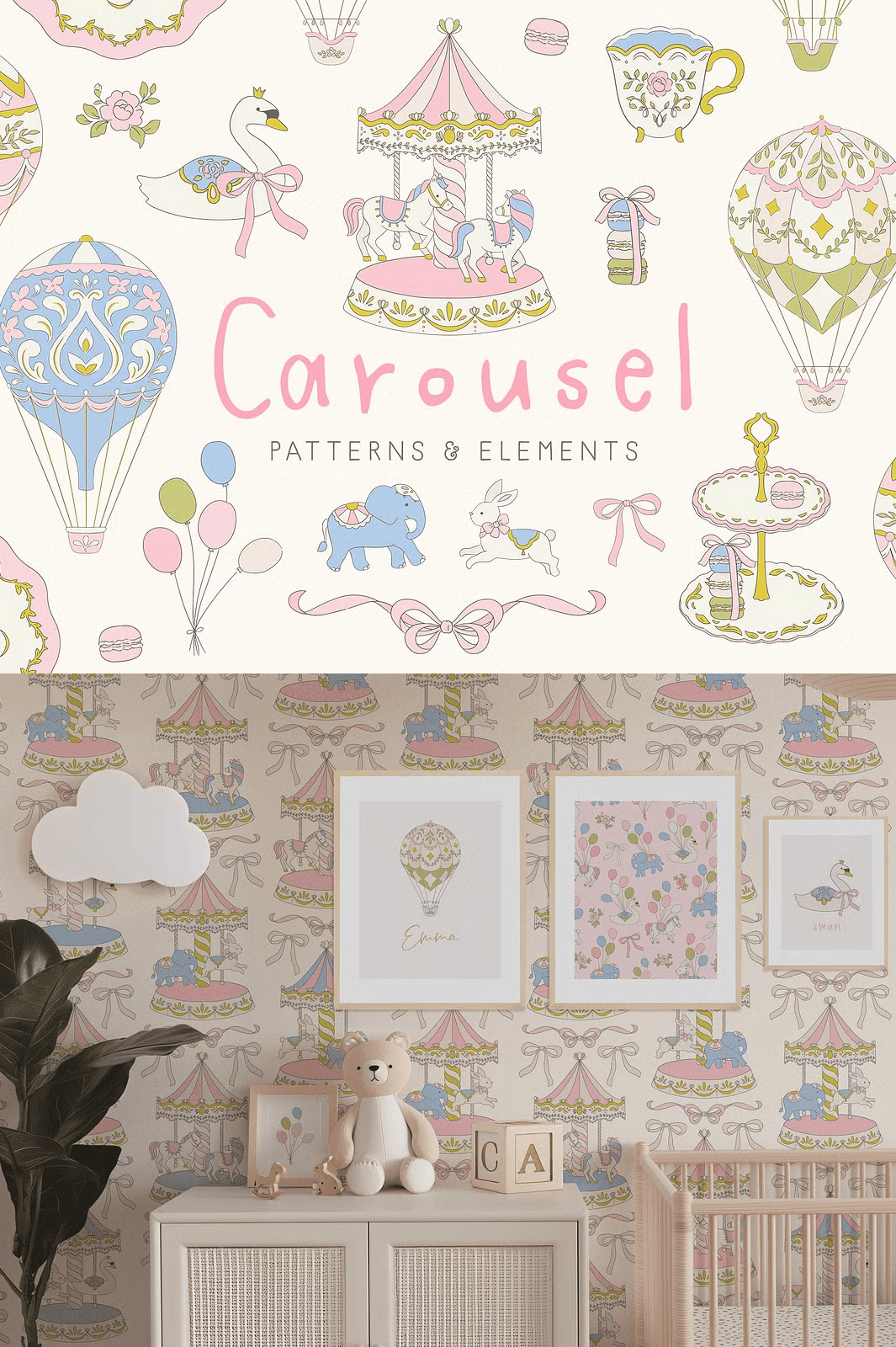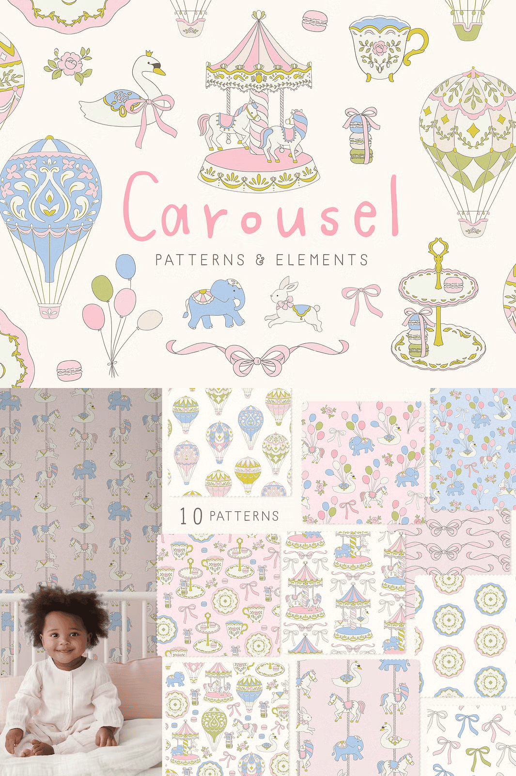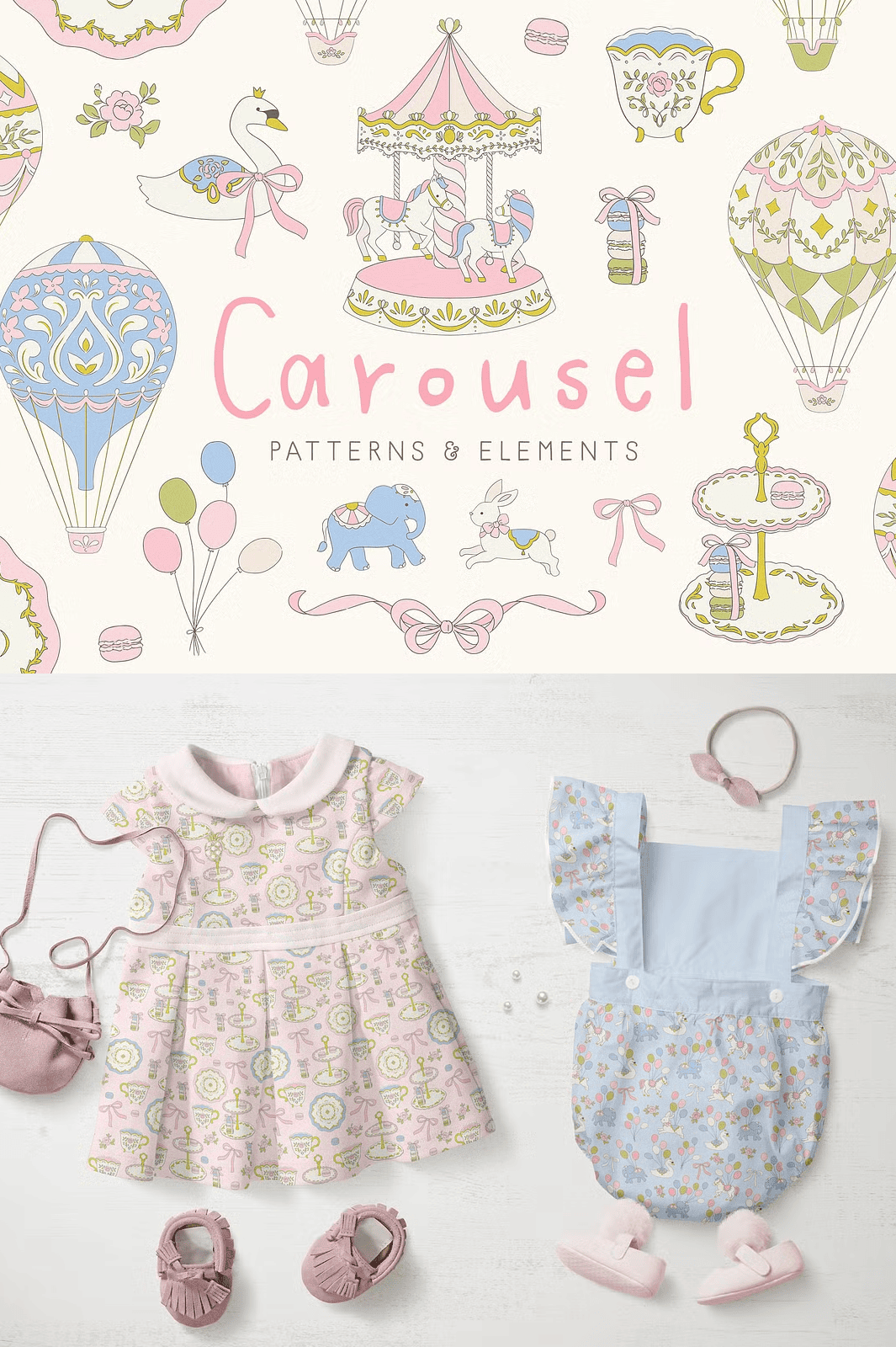 From festive invitations to whimsical branding, the Carousel set is engineered to make your design process faster, more dynamic, and deeply engaging. Use the clipart elements to craft joyful scenes for children’s books, birthday cards, nursery decor, or themed party supplies. Apply the seamless patterns as backgrounds for websites, textiles, stationery, or fabric designs for clothing and accessories.