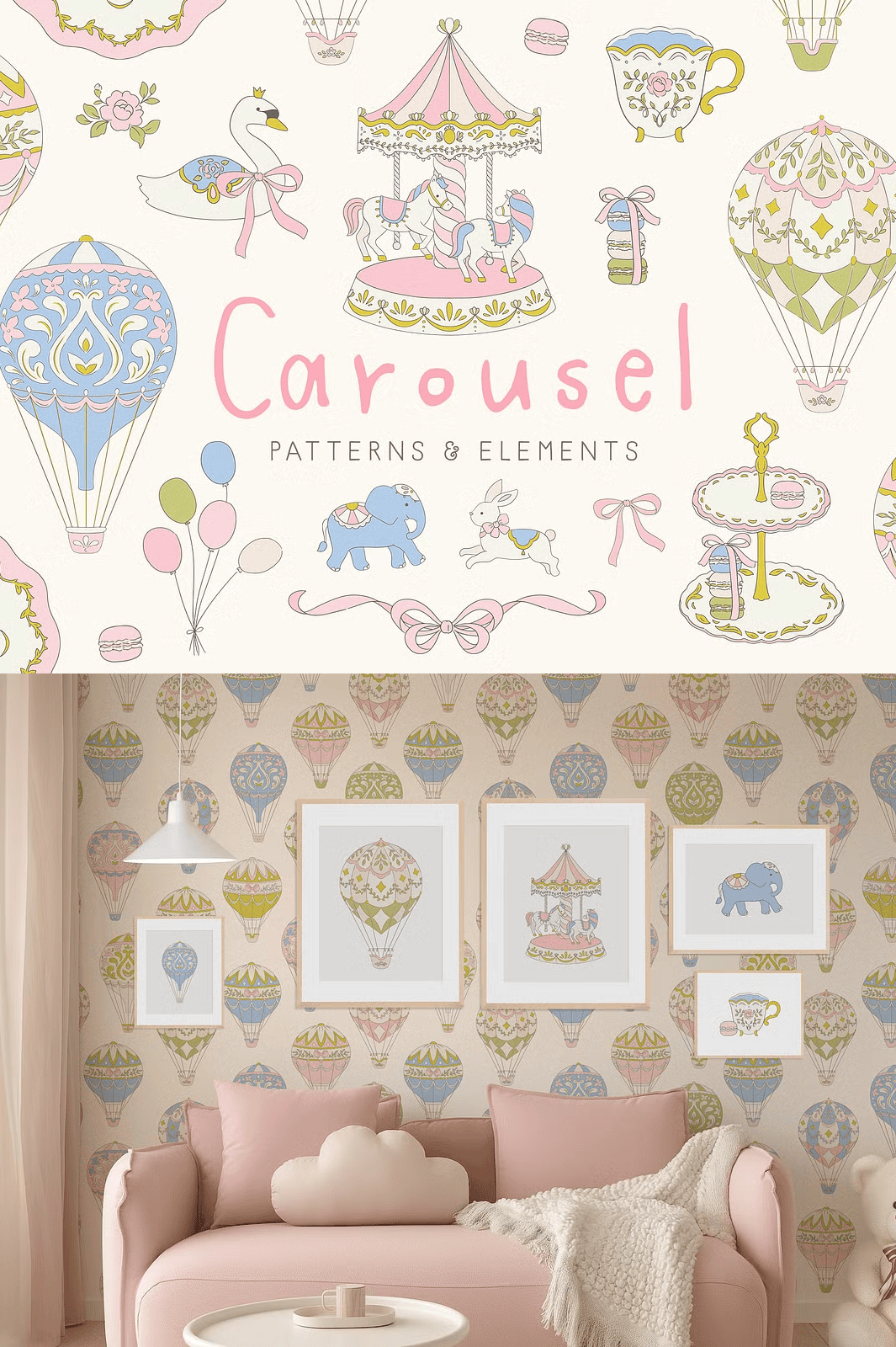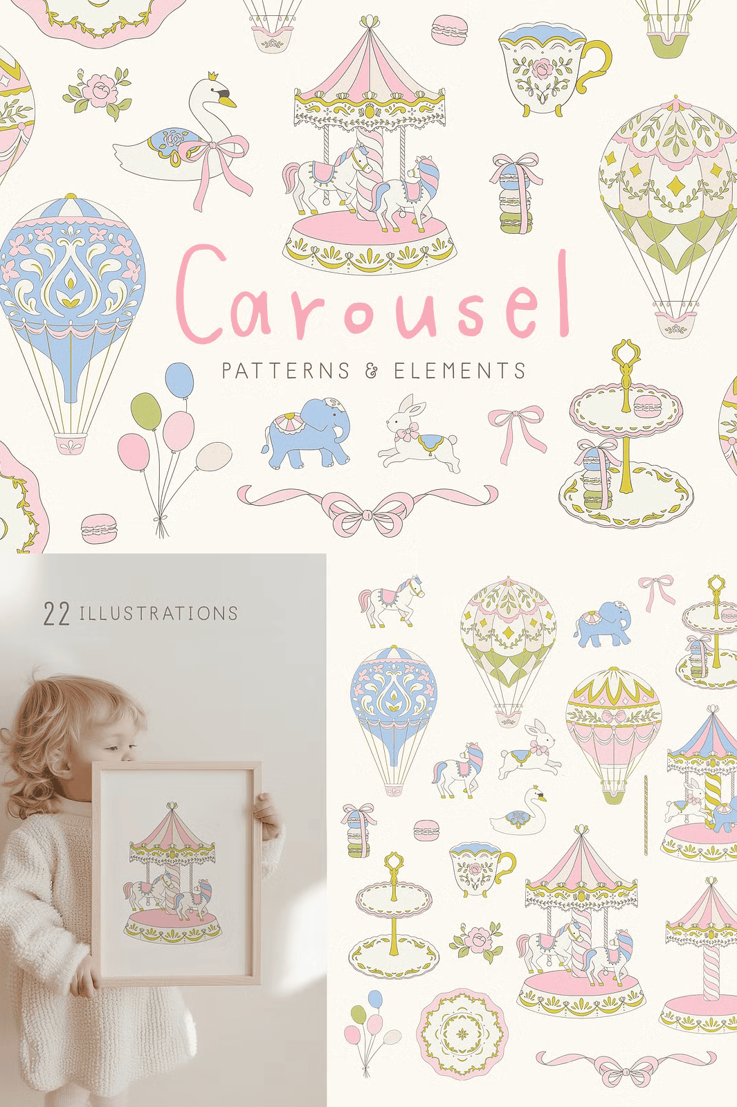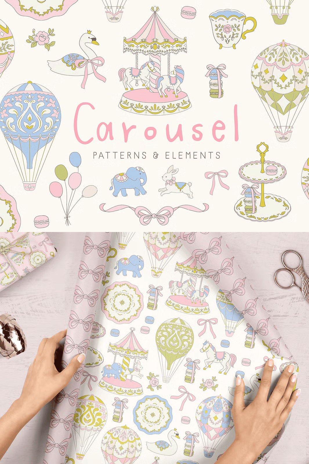 From festive invitations to whimsical branding, the Carousel set is engineered to make your design process faster, more dynamic, and deeply engaging. Use the clipart elements to craft joyful scenes for children’s books, birthday cards, nursery decor, or themed party supplies. Apply the seamless patterns as backgrounds for websites, textiles, stationery, or fabric designs for clothing and accessories.