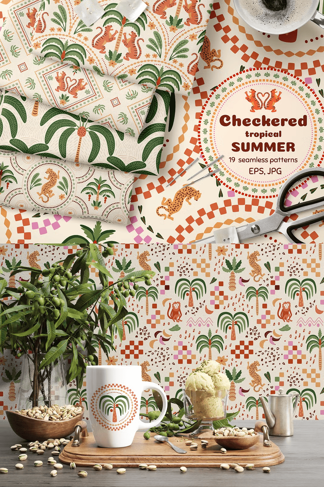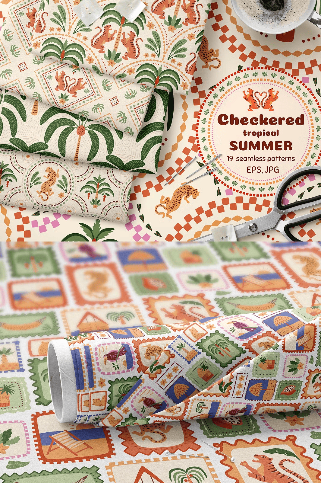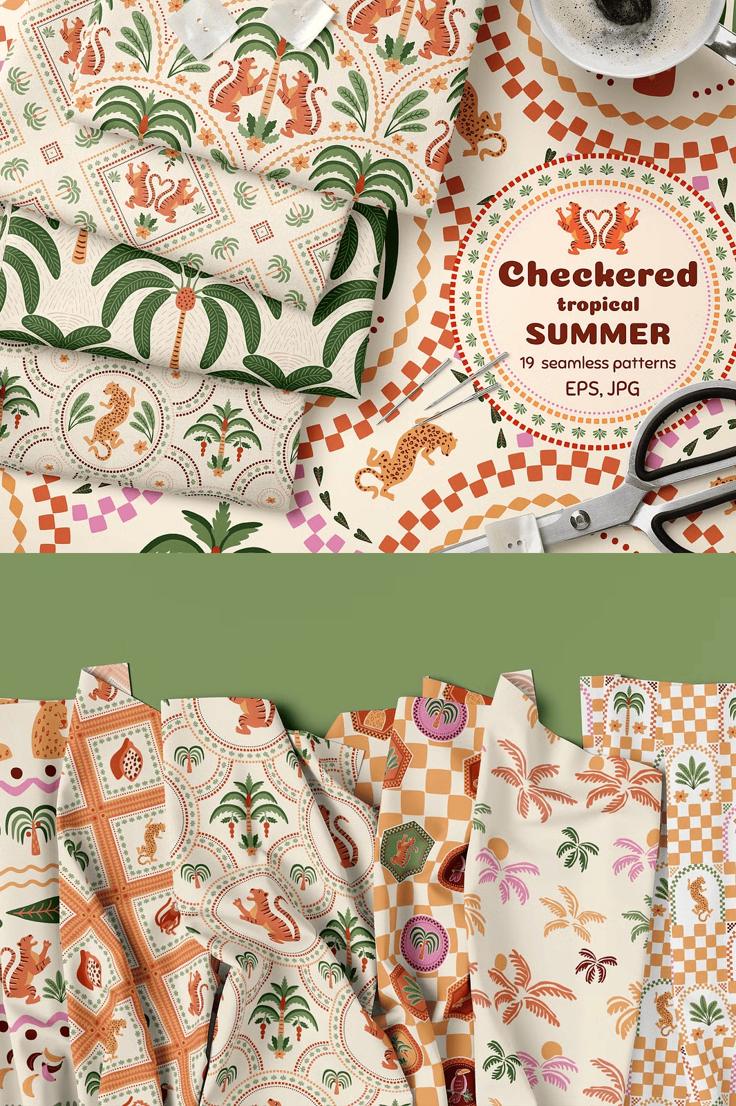Discover the lively essence of summer with this **Checkered Tropical Summer Seamless Pattern Set**, a beautifully hand-crafted collection designed to infuse your projects with tropical charm and geometric sophistication. These patterns combine soft pastel colors with playful jungle motifs like palm trees, tigers, and leopards framed in ceramic tile–style checkered designs. Perfect for a wide variety of creative applications, this set is ready to elevate your wallpapers, textiles, fashion apparel, packaging, invitations, and more.