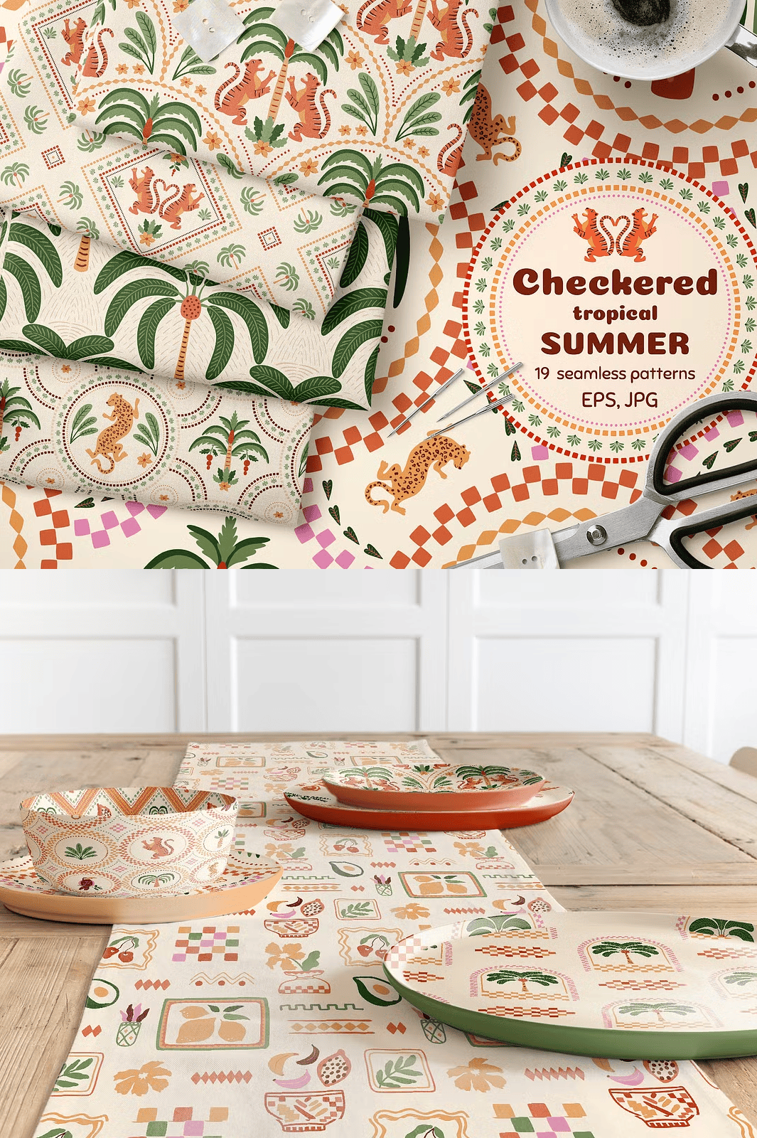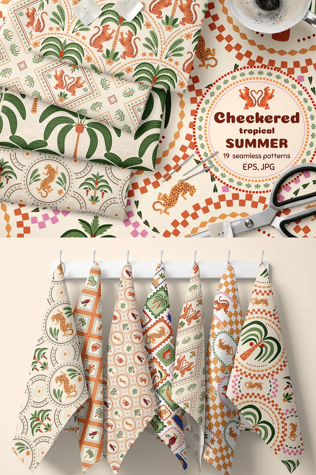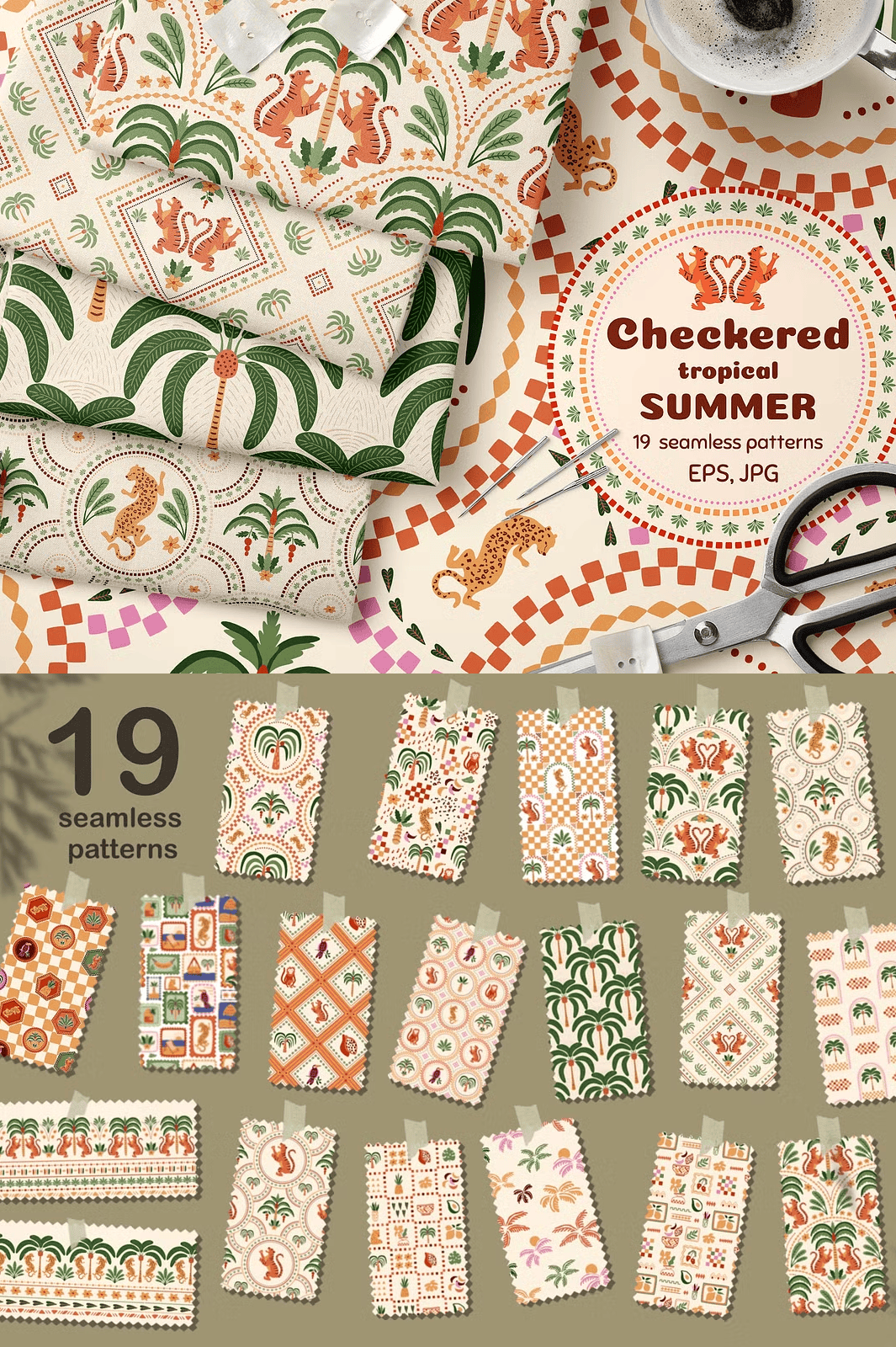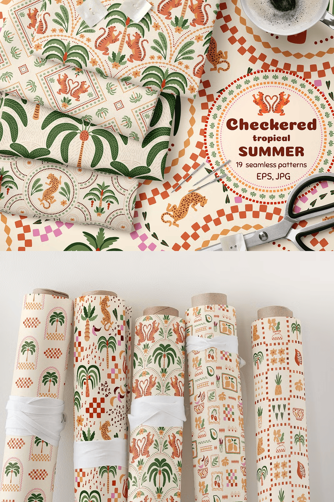 Discover the lively essence of summer with this **Checkered Tropical Summer Seamless Pattern Set**, a beautifully hand-crafted collection designed to infuse your projects with tropical charm and geometric sophistication. These patterns combine soft pastel colors with playful jungle motifs like palm trees, tigers, and leopards framed in ceramic tile–style checkered designs. Perfect for a wide variety of creative applications, this set is ready to elevate your wallpapers, textiles, fashion apparel, packaging, invitations, and more.