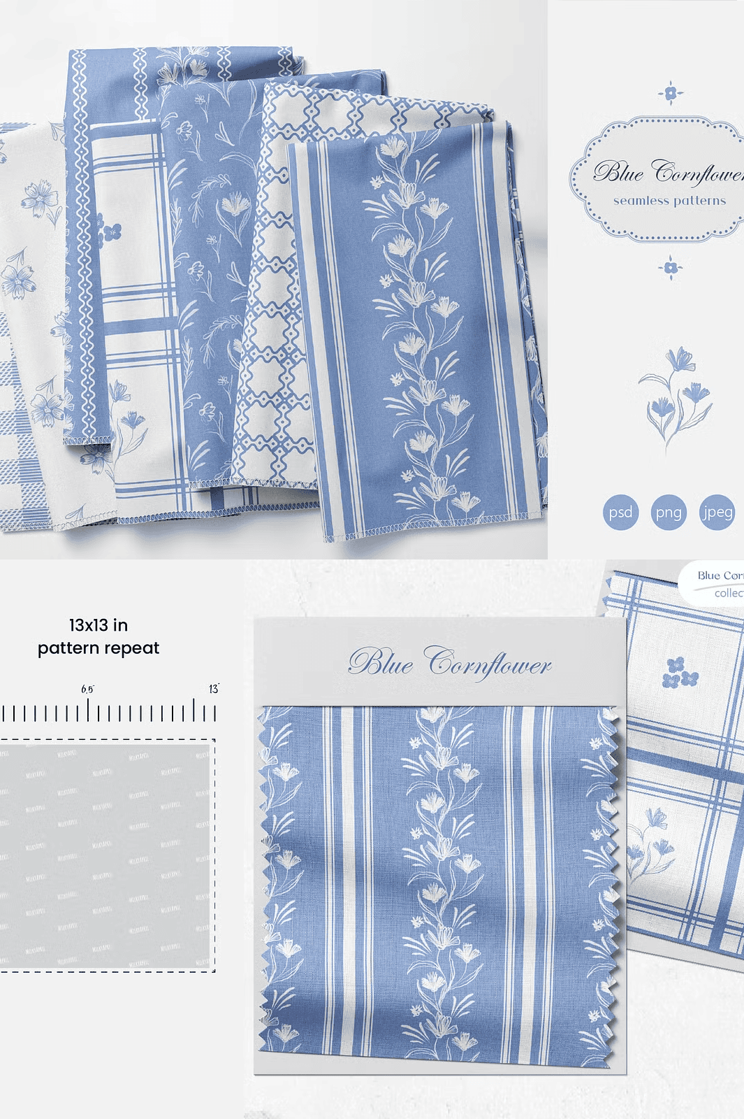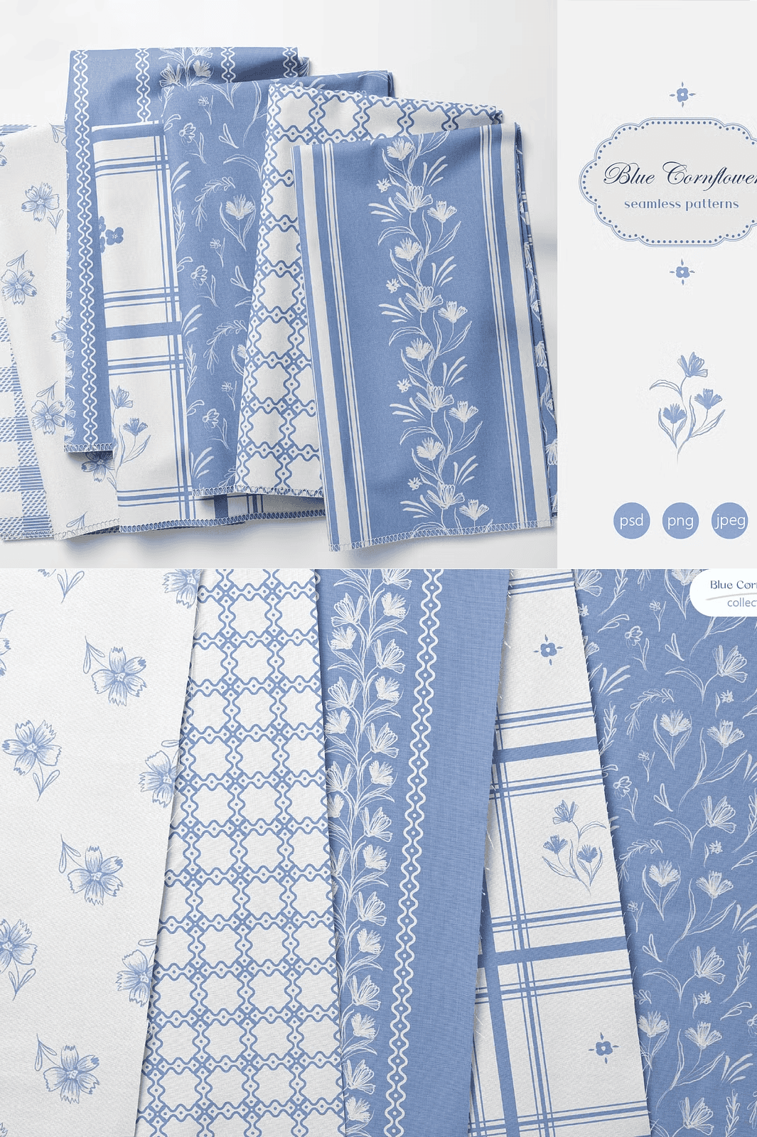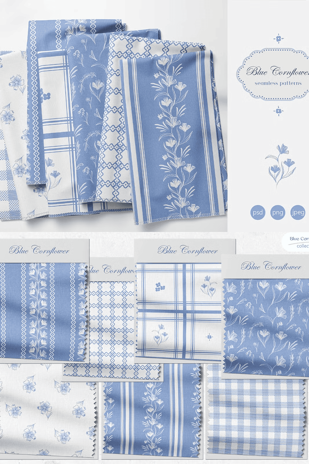 Unlock the serene beauty of nature with the **Blue Cornflower Seamless Patterns** collection — a delicate yet powerful set of 7 handcrafted, fully repeatable designs that blend traditional wildflower motifs with subtle geometric textures. Perfectly suited for cottagecore aesthetics, this collection captures the soft, nostalgic spirit of countryside life through a modern, professional lens.