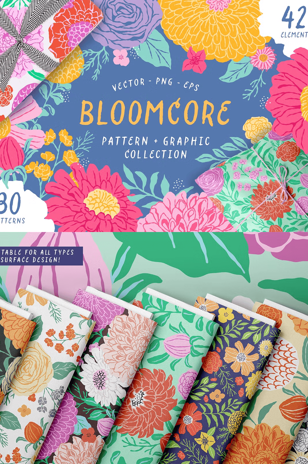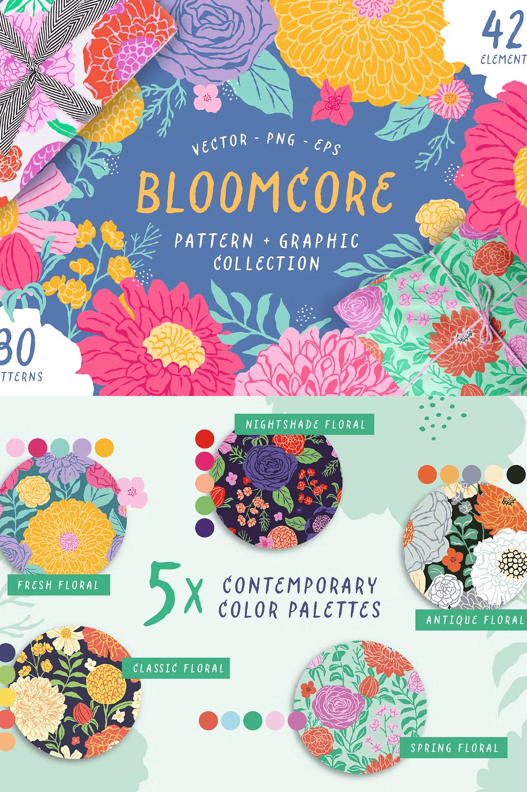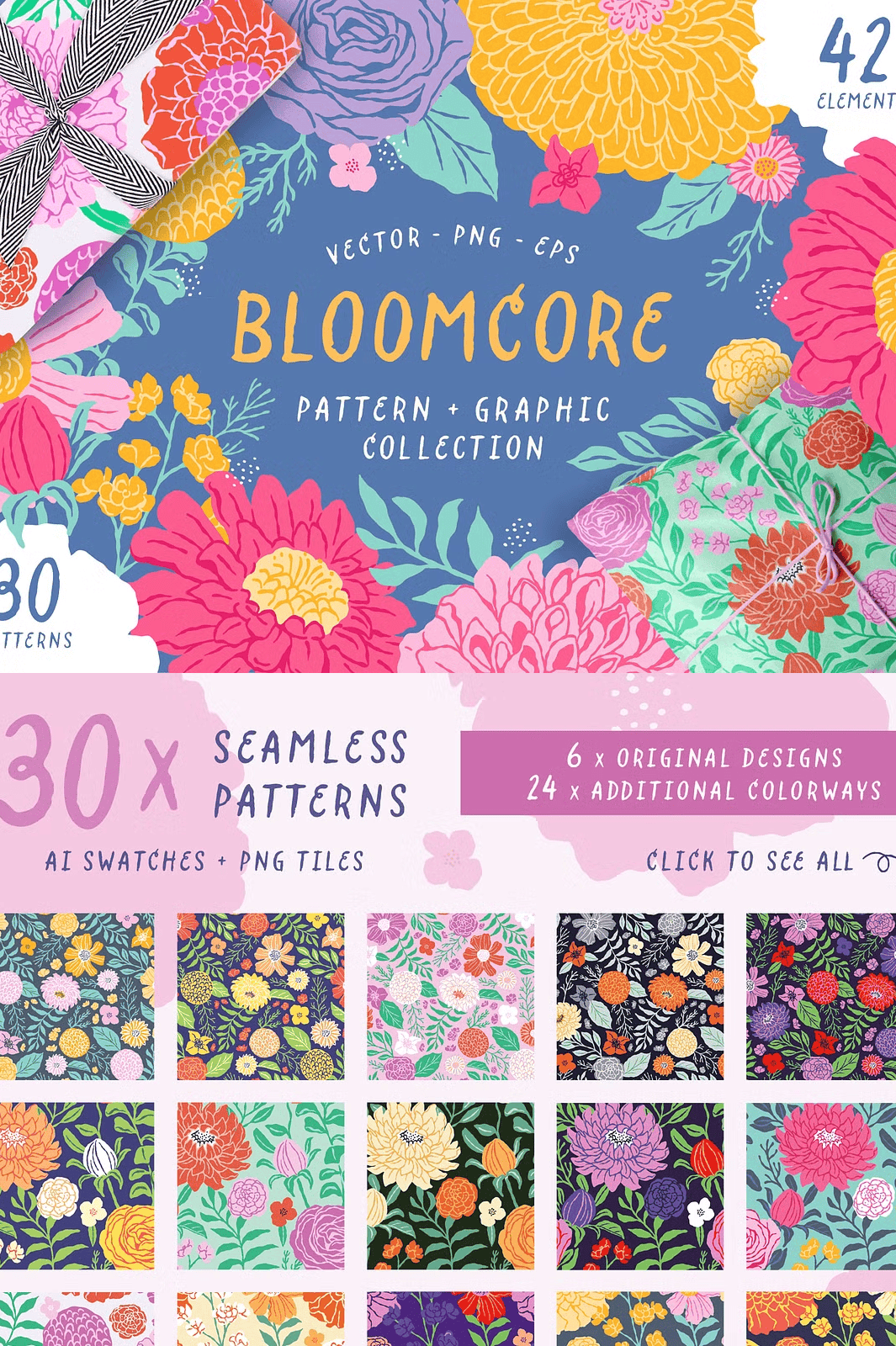 Step into a world where color meets craft, where every petal tells a story, and every pattern pulses with life. **Bloomcore** isn’t just a collection—it’s a creative revolution in floral design. This stunning suite delivers **30 dynamic vector patterns** and **42 meticulously hand-drawn floral elements**, each crafted with a painterly style that bridges modern illustration and timeless botanical elegance.