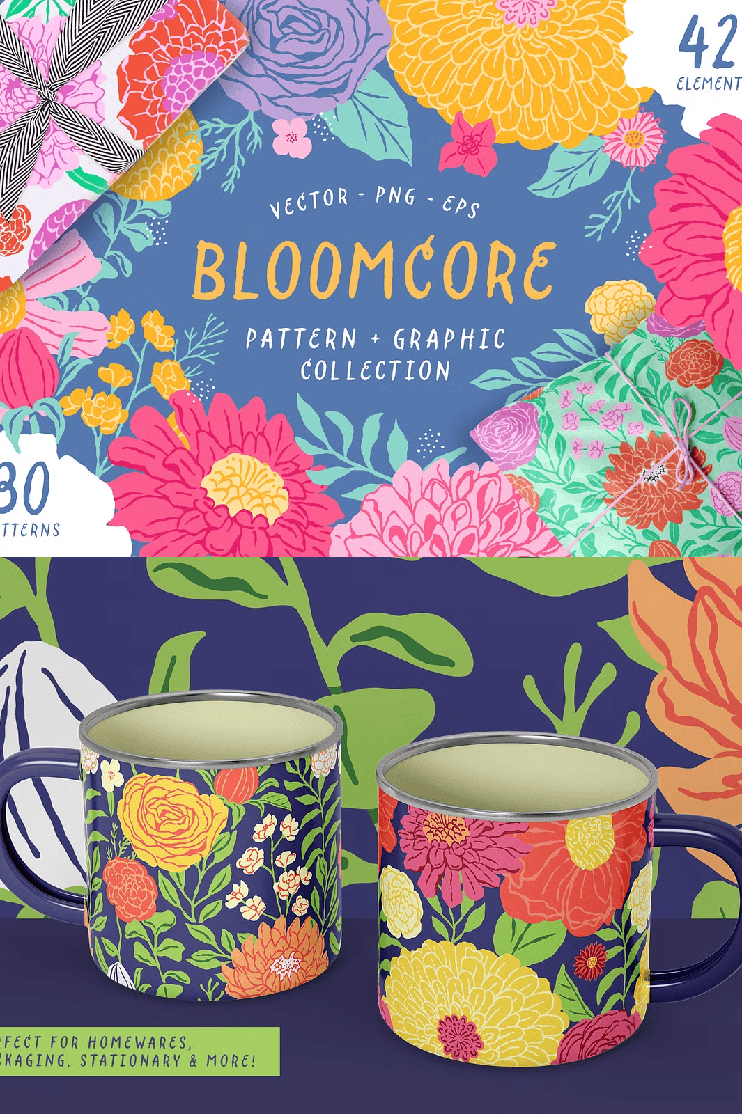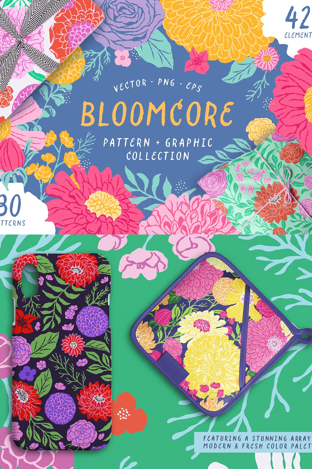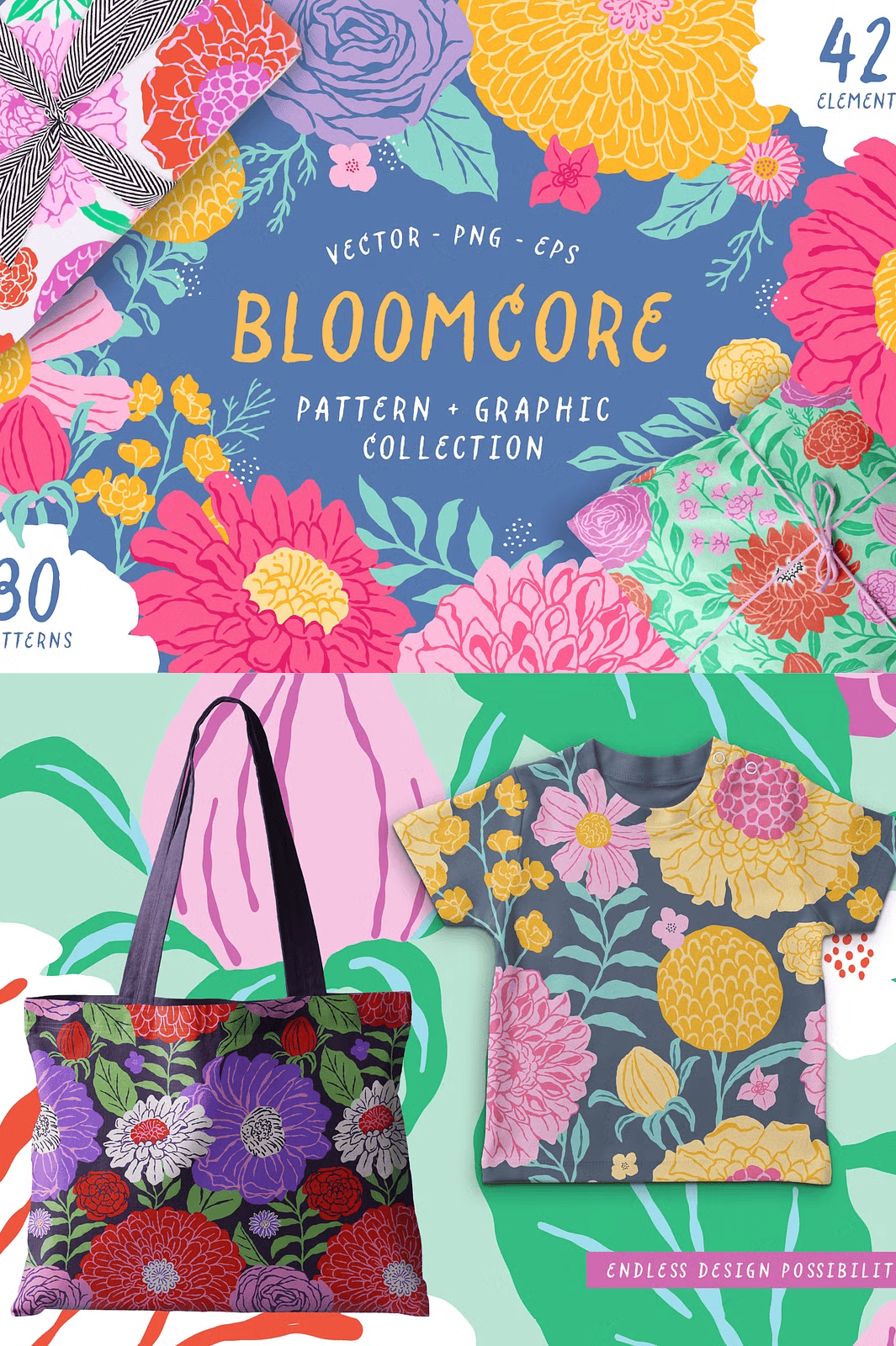 Step into a world where color meets craft, where every petal tells a story, and every pattern pulses with life. **Bloomcore** isn’t just a collection—it’s a creative revolution in floral design. This stunning suite delivers **30 dynamic vector patterns** and **42 meticulously hand-drawn floral elements**, each crafted with a painterly style that bridges modern illustration and timeless botanical elegance.
