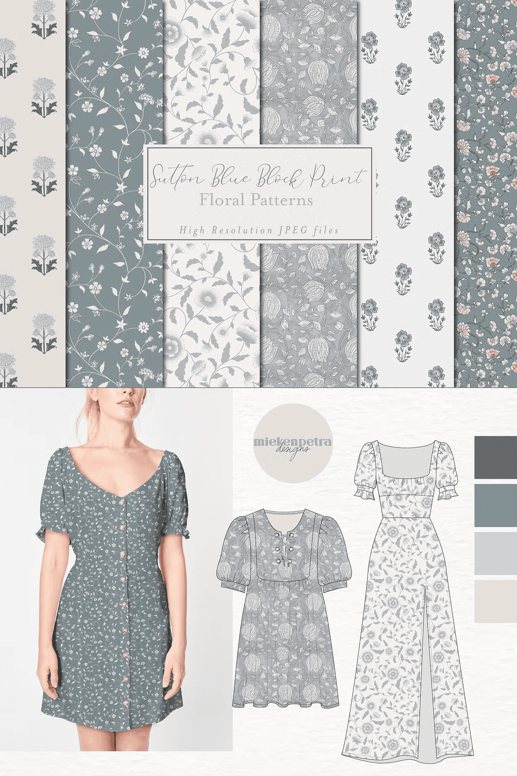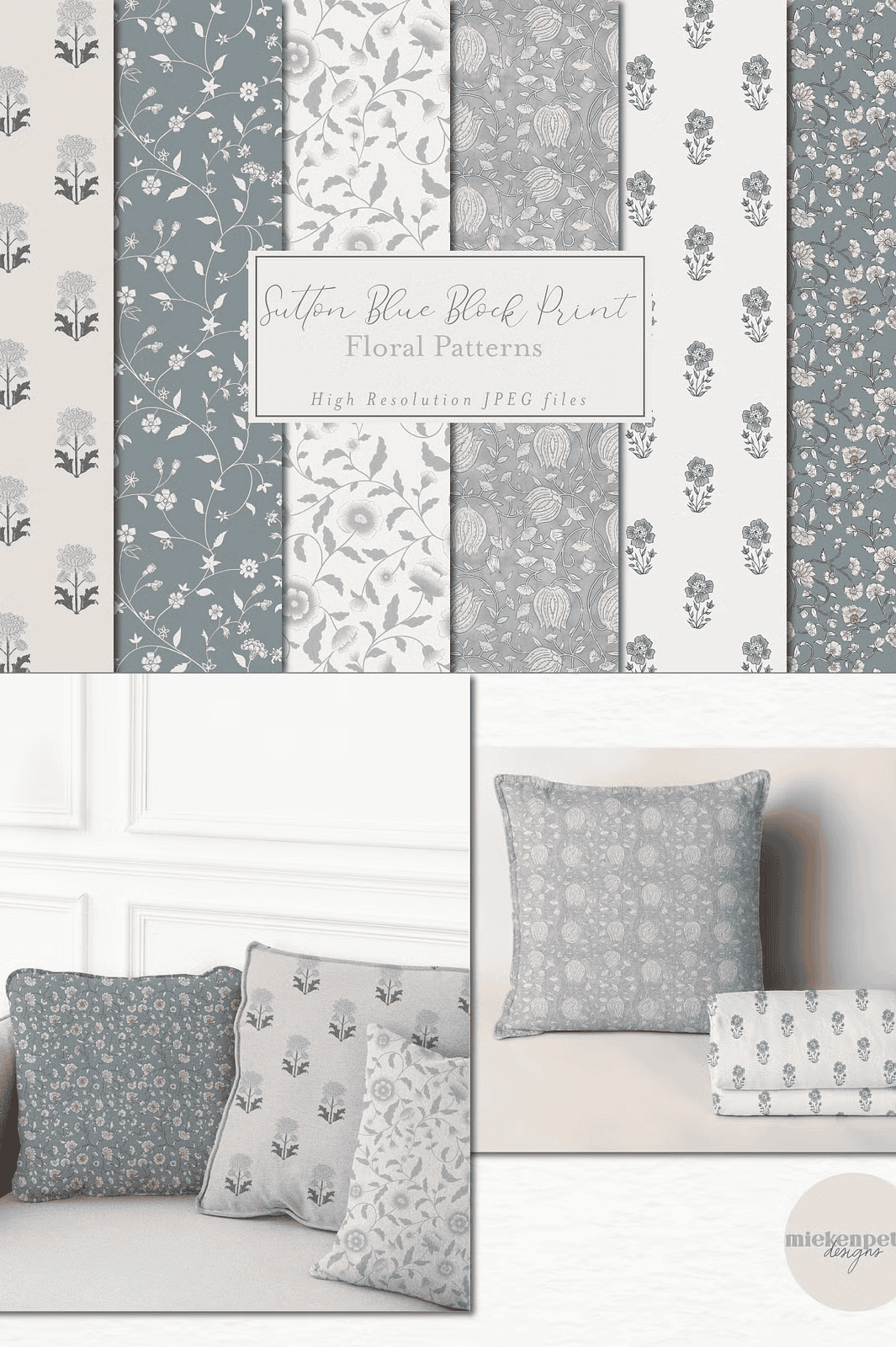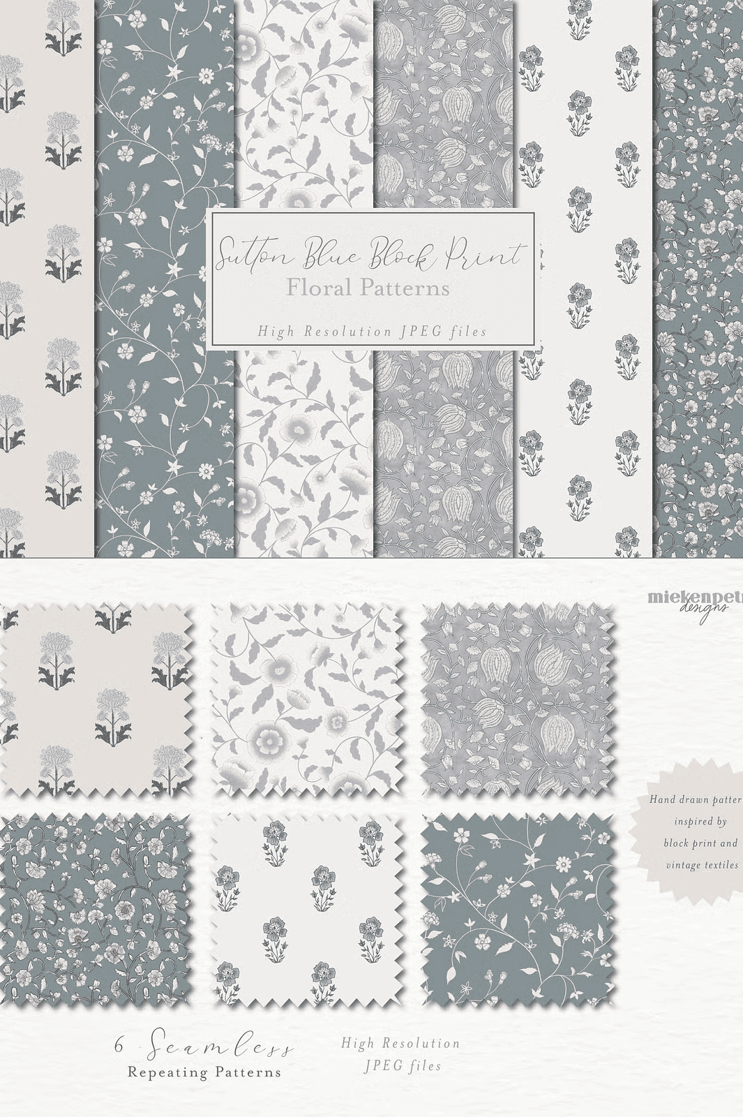 Every pattern in this collection reflects a rich heritage of block printing techniques, enhanced with a modern twist. The calm Sutton blue palette delivers a sophisticated, nuanced look that evokes vintage charm while remaining fresh and relevant. These patterns are designed to be infinitely tileable, enabling smooth, continuous repeats without visible edges or inconsistencies, which translates to professional-grade output every time.