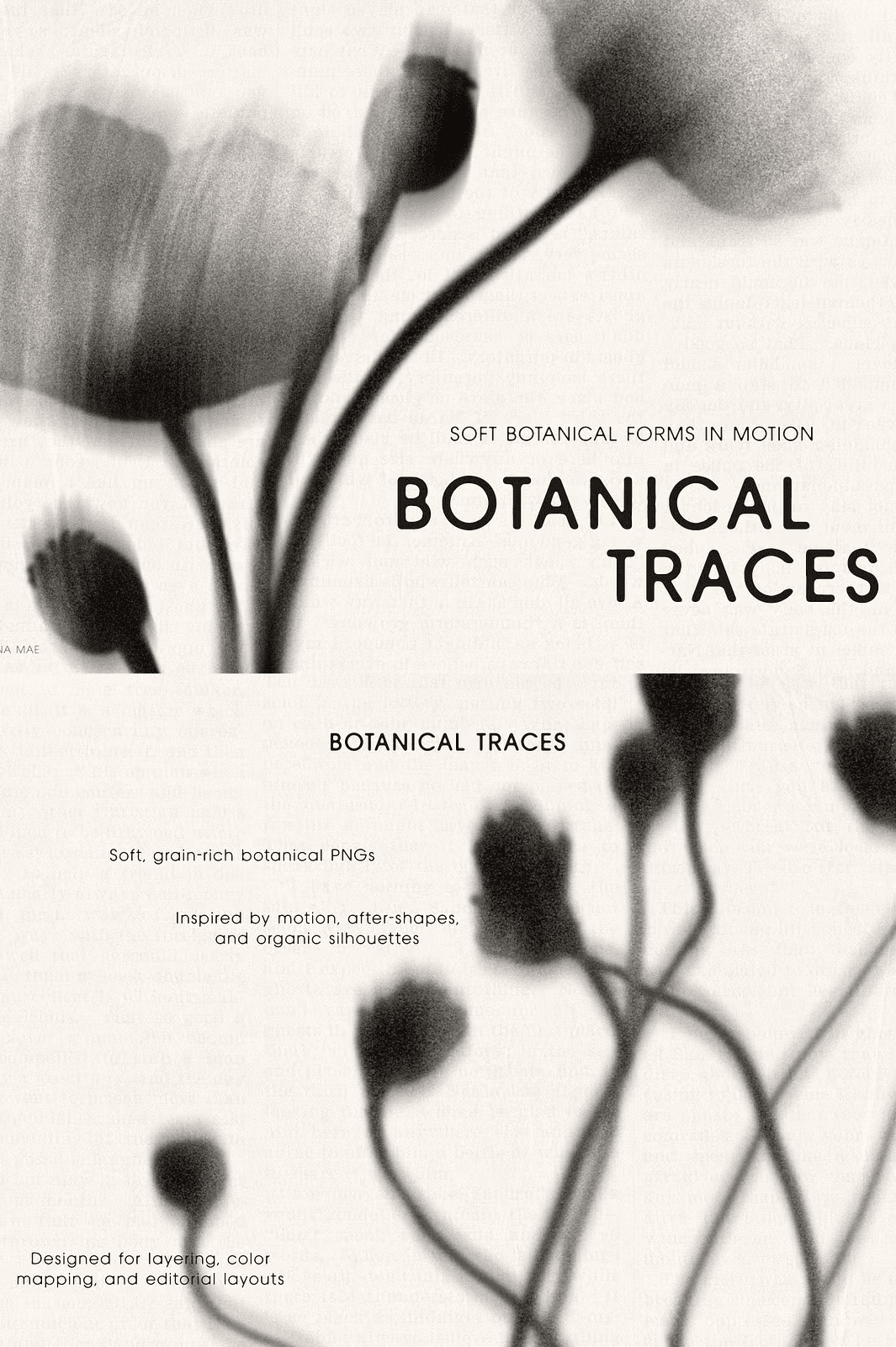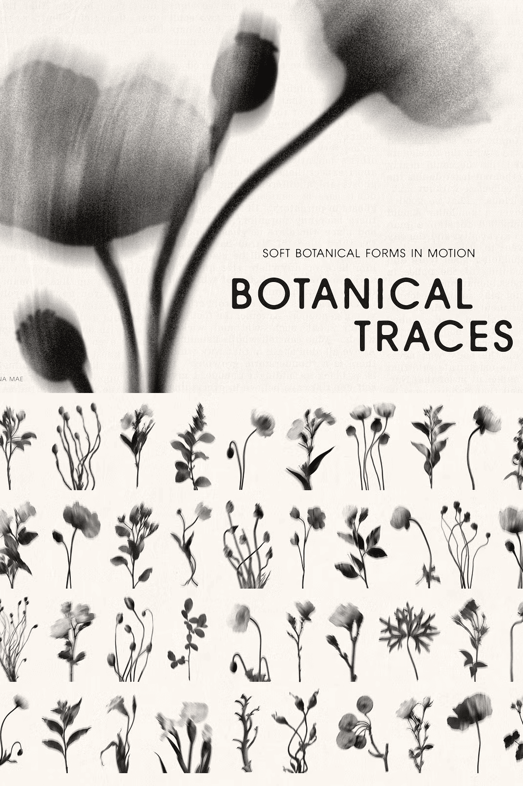 Step into a world of delicate expression with **Botanical Traces**, a thoughtfully curated collection of 160 soft, grain-rich floral PNGs. Inspired by motion, after-images, and organic silhouettes, each image captures the gentle blur and fluid grace of nature in motion. The subtle grain and diffused edges infuse every design with a sense of quiet energy, making these assets ideal for layered compositions, dreamy visual storytelling, and evocative conceptual work.