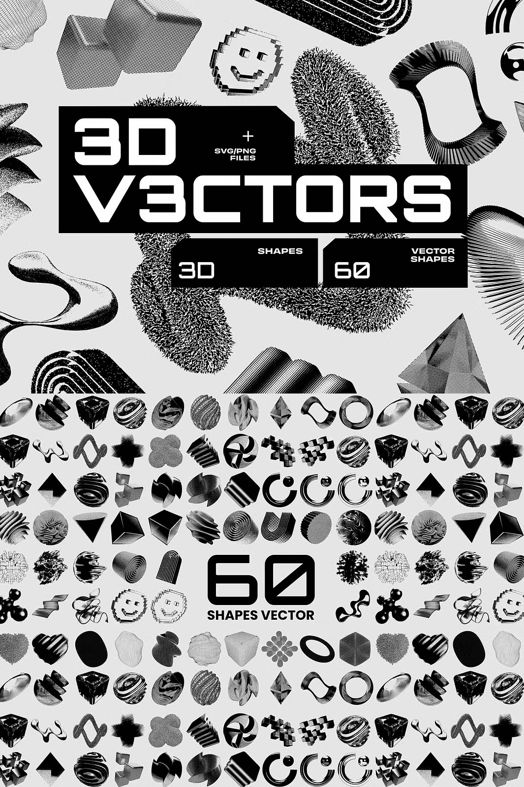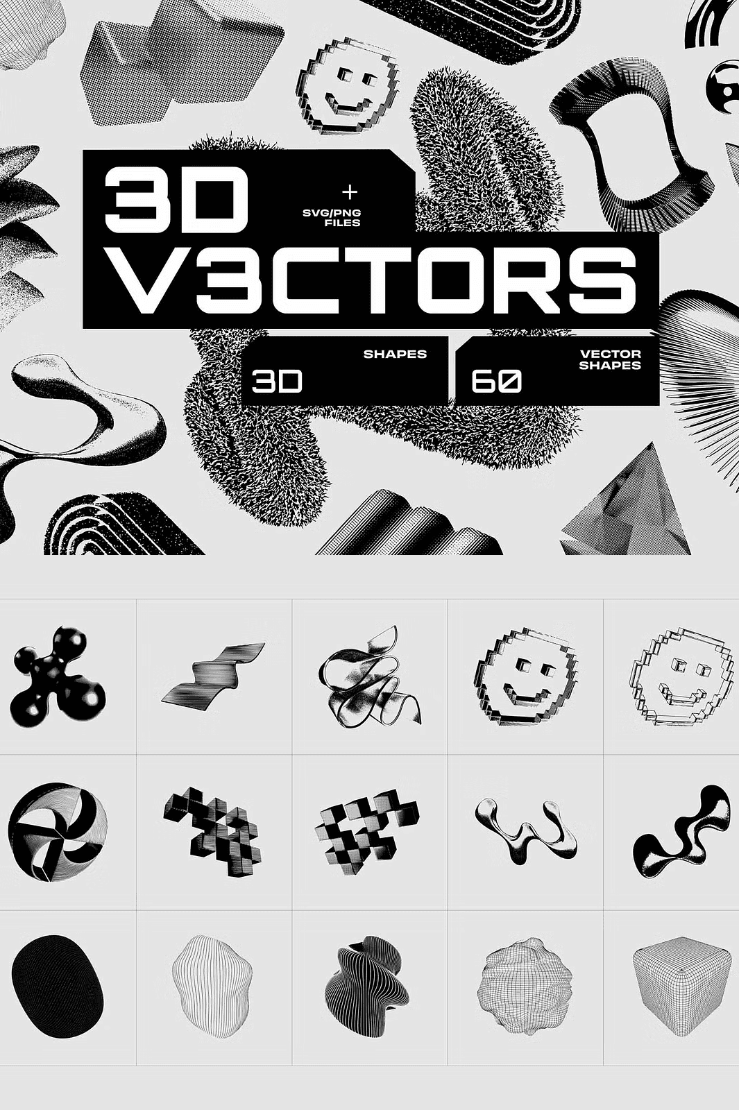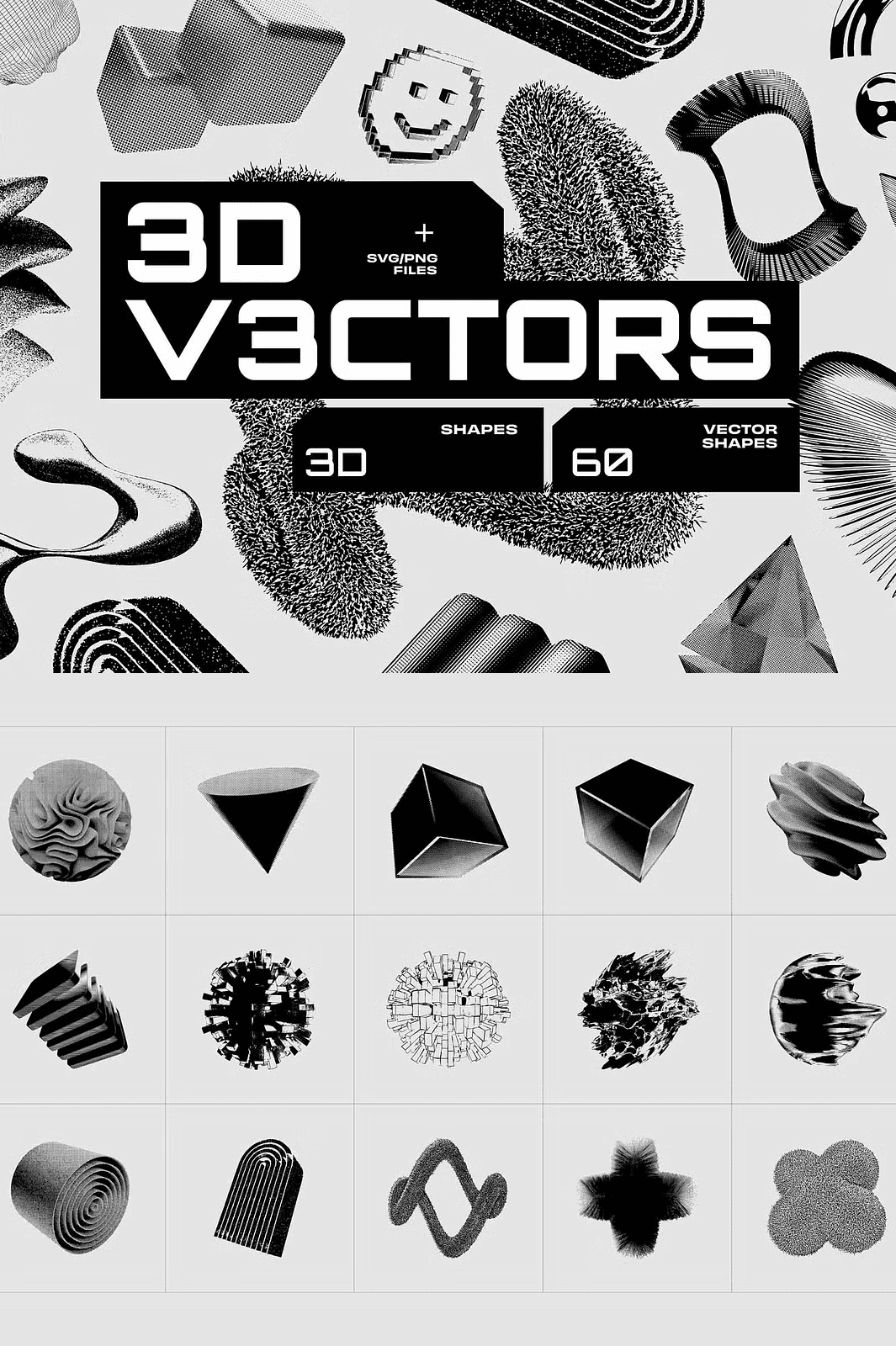 - 60 Equally Detailed 3D Vector Shapes in Black: High-contrast silhouettes perfect for dark-themed designs, contrast-driven layouts, or editorial spreads.