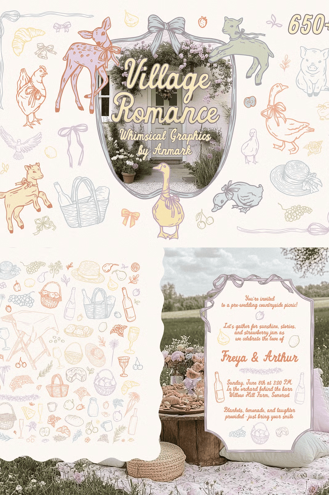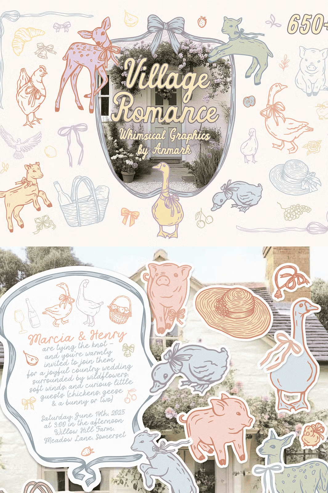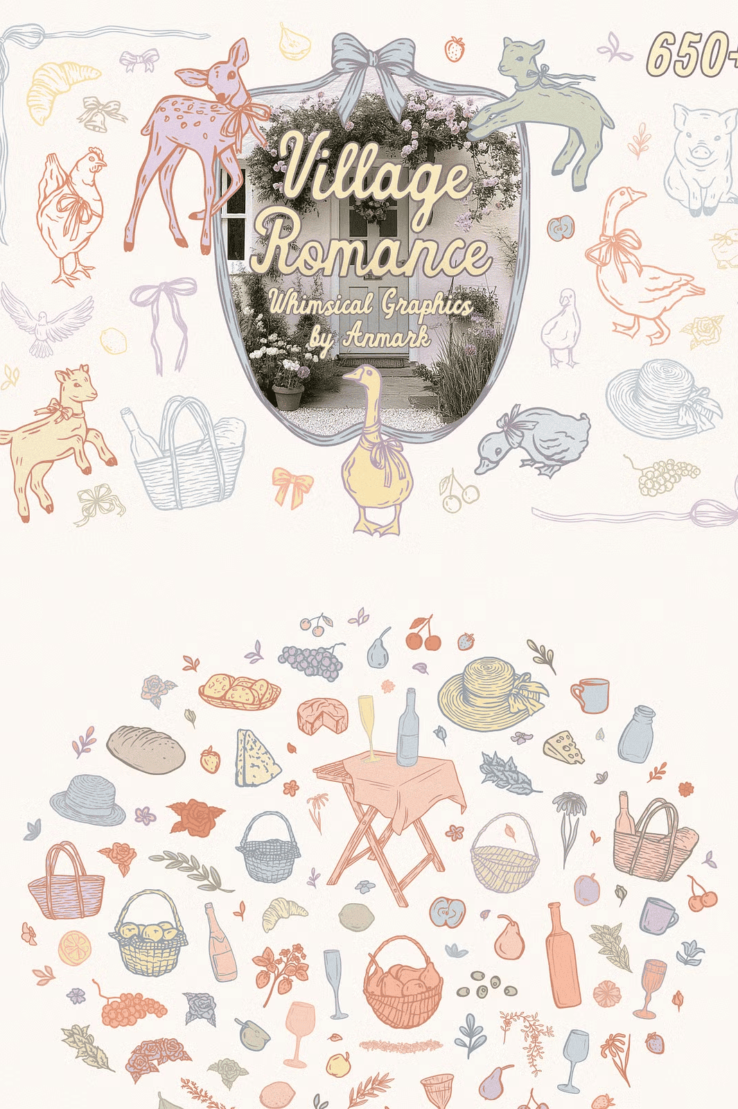 Uncover the quiet magic of village life and romantic countryside weddings with Village Romance Whimsical Graphics a meticulously hand-drawn collection of 651 illustrations crafted to inspire warmth, nostalgia, and visual storytelling. Each element pulses with gentle character: delicate bows tied by unseen hands, fluttering birds in pastoral skies, dainty farm animals grazing at golden hour, and wildflowers growing between cobbled paths. This isn’t just a graphic pack it’s an invitation to design with soul, warmth, and a quiet sense of wonder.