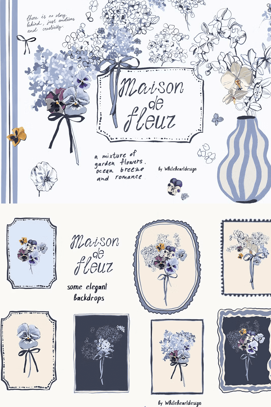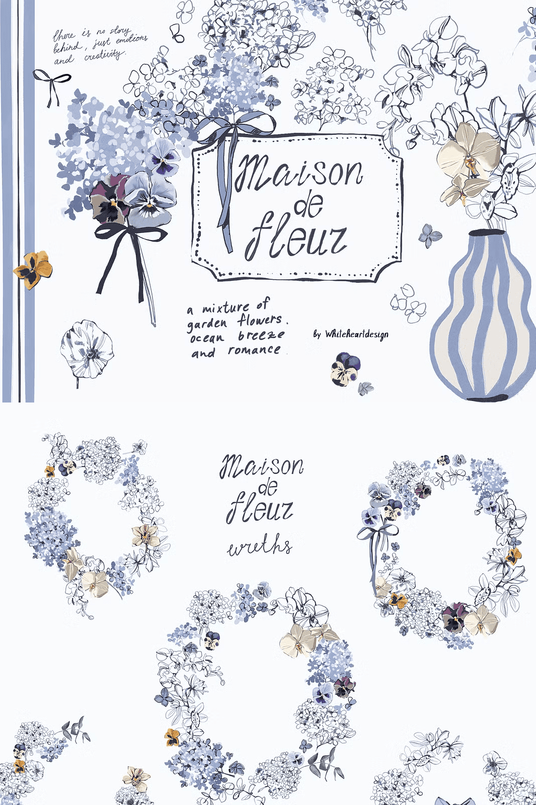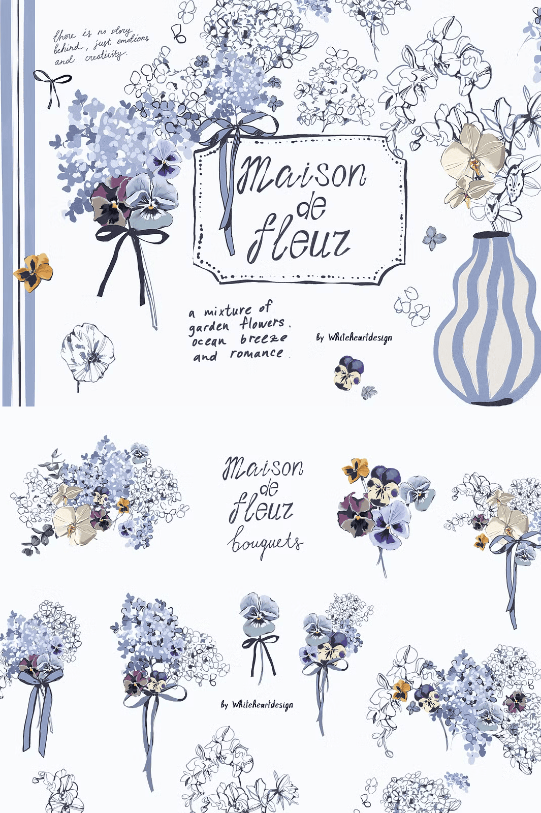 Transform your creative projects with the **Maison De Fleur** collection a stunning hand-drawn floral clipart set bursting with charm, texture, and coastal inspiration. Crafted entirely by artist Yuliya, this meticulously designed bundle fuses delicate line work with expressive gouache textures, bringing to life a dreamy world of blue hydrangeas, petite pansies, and graceful white orchids. Set in a serene palette of dusty blue, navy, and ivy-white, these illustrations evoke the soft nostalgia of seaside cottages, sun-bleached linen, and coastal breezes elevating every design with timeless elegance and gentle personality.