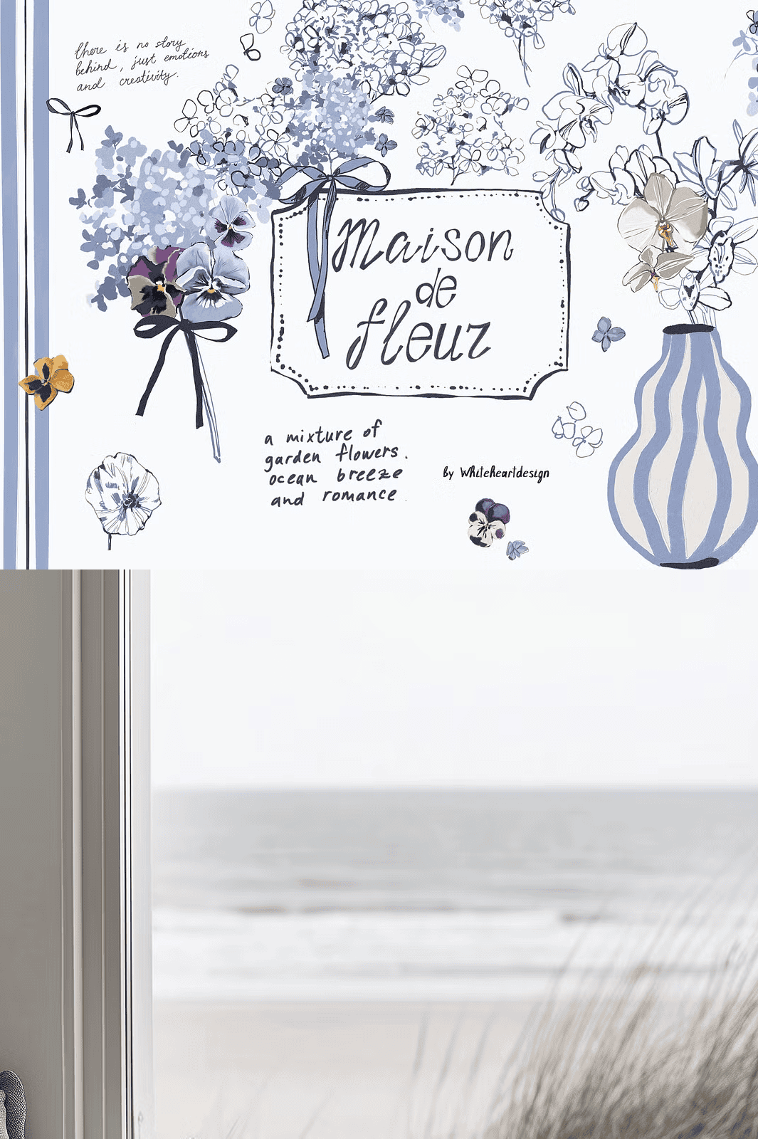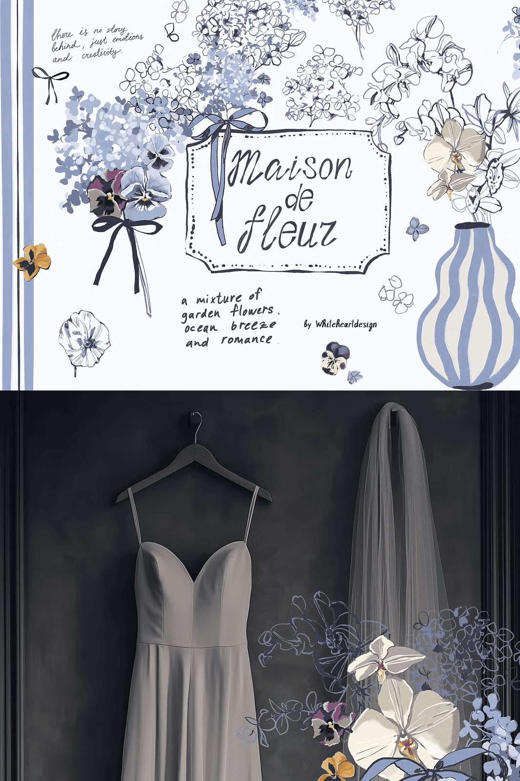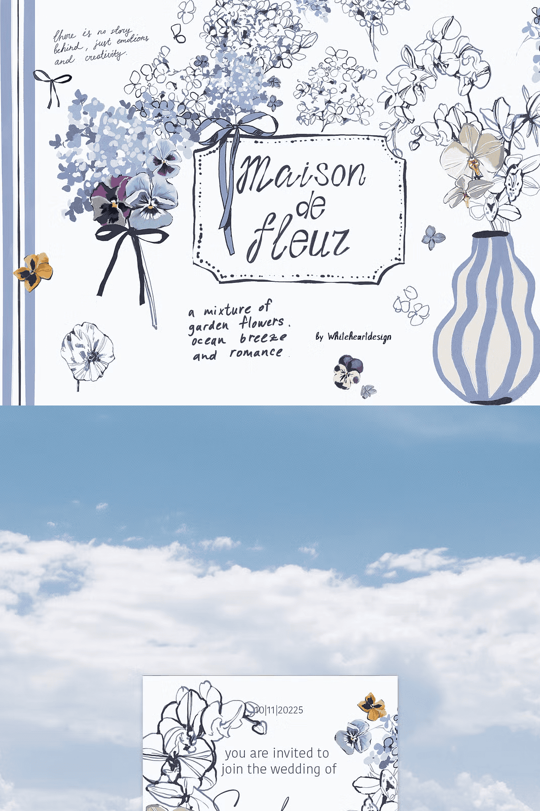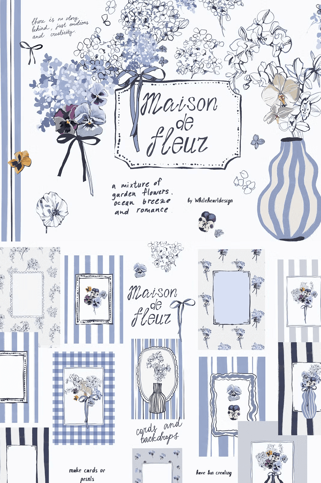 Transform your creative projects with the **Maison De Fleur** collection a stunning hand-drawn floral clipart set bursting with charm, texture, and coastal inspiration. Crafted entirely by artist Yuliya, this meticulously designed bundle fuses delicate line work with expressive gouache textures, bringing to life a dreamy world of blue hydrangeas, petite pansies, and graceful white orchids. Set in a serene palette of dusty blue, navy, and ivy-white, these illustrations evoke the soft nostalgia of seaside cottages, sun-bleached linen, and coastal breezes elevating every design with timeless elegance and gentle personality.