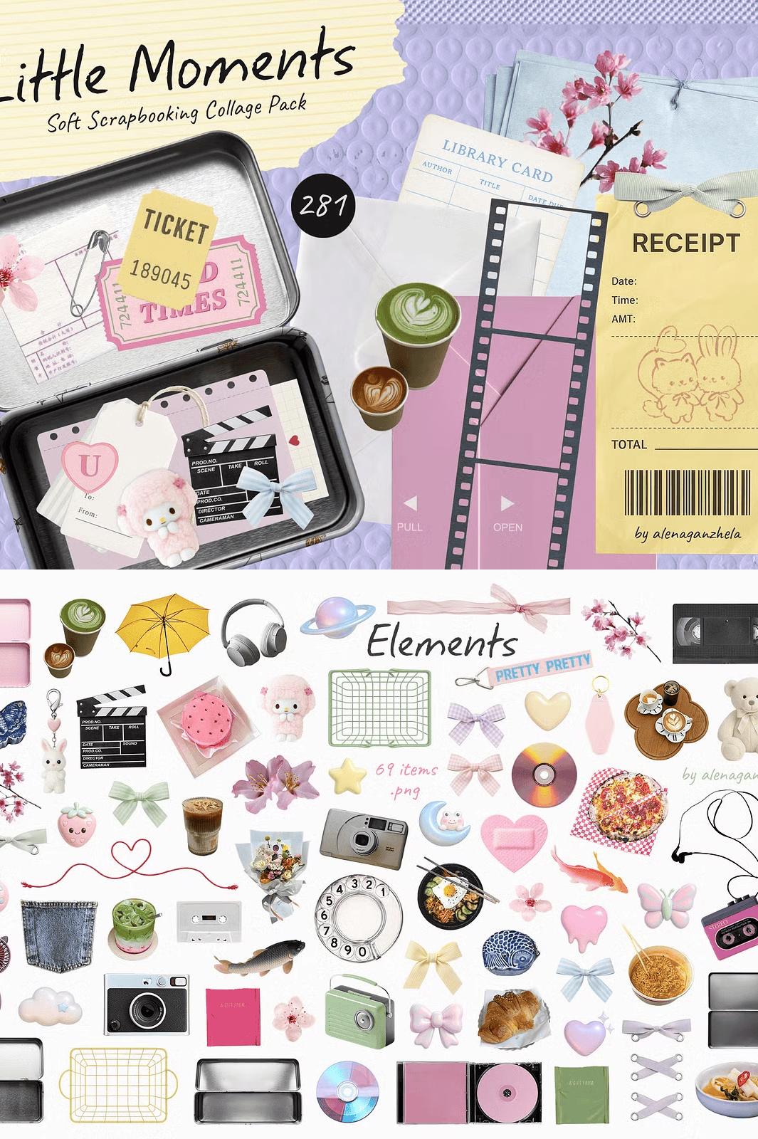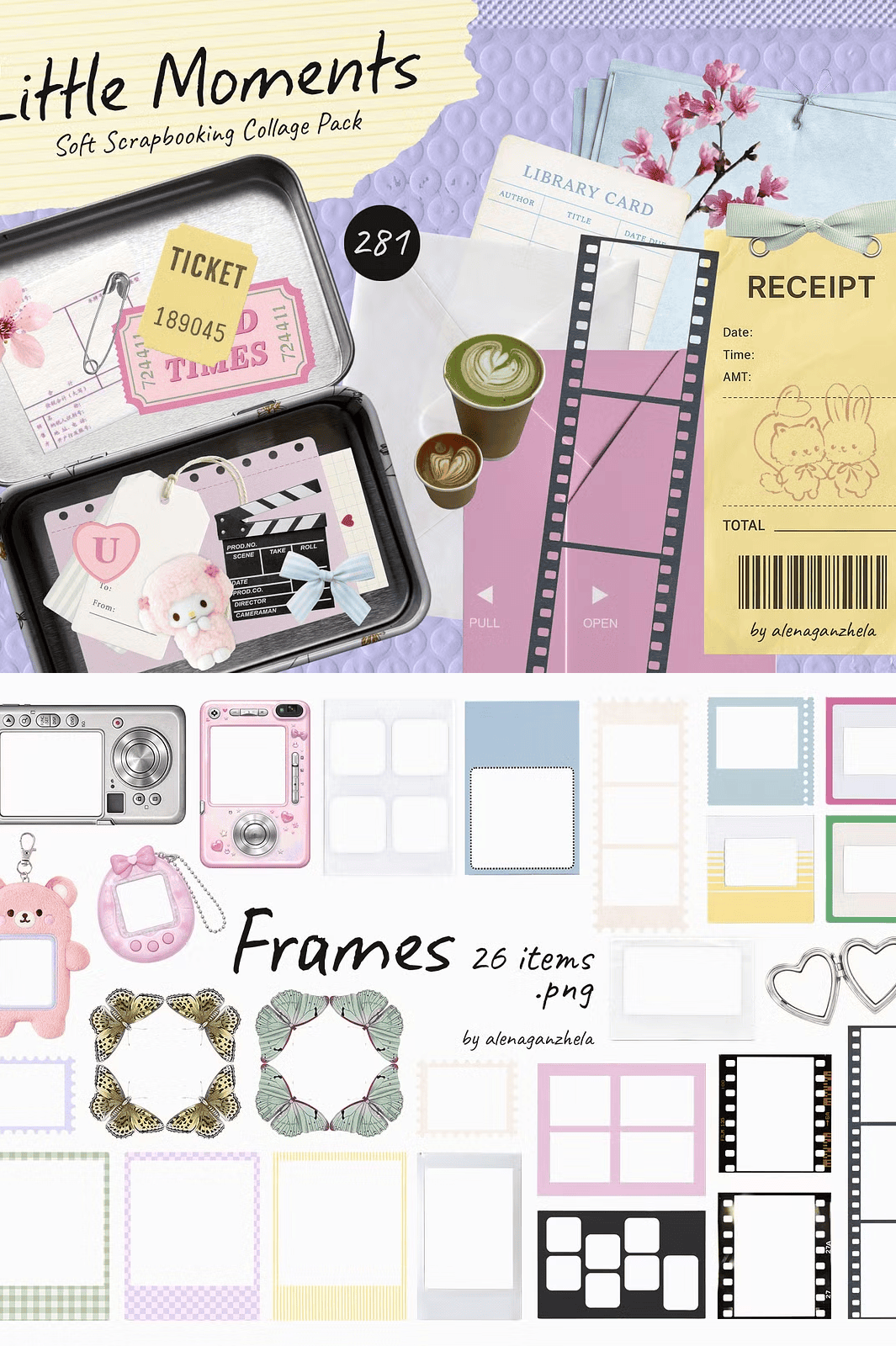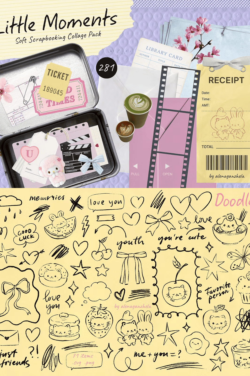 This collection offers a robust range of high-quality elements, ideal for digital collages, journals, scrapbook pages, social media graphics, and mood boards. Enjoy seamless integration of various textures, frames, papers, and doodles to bring your stories to life, including: