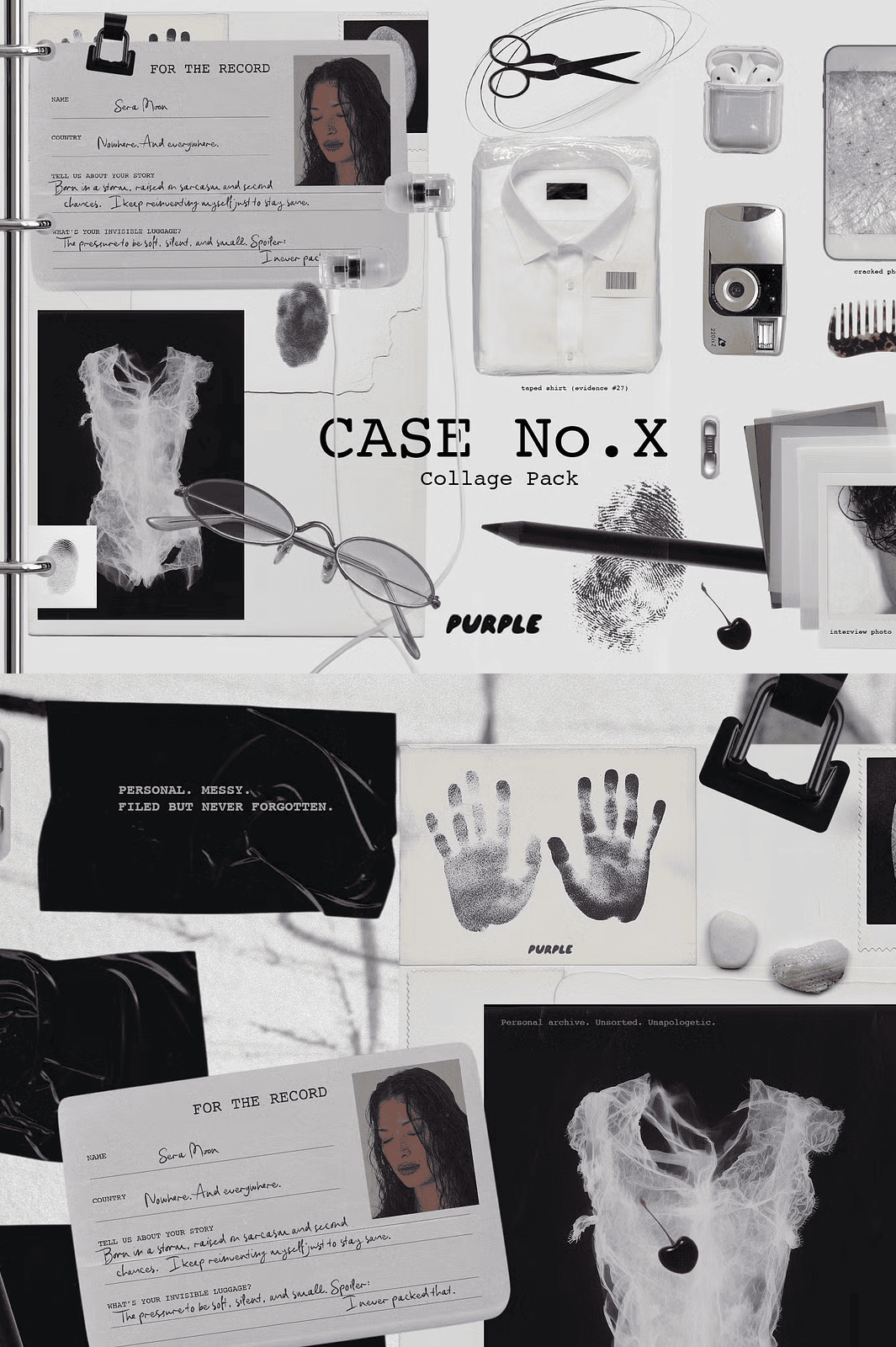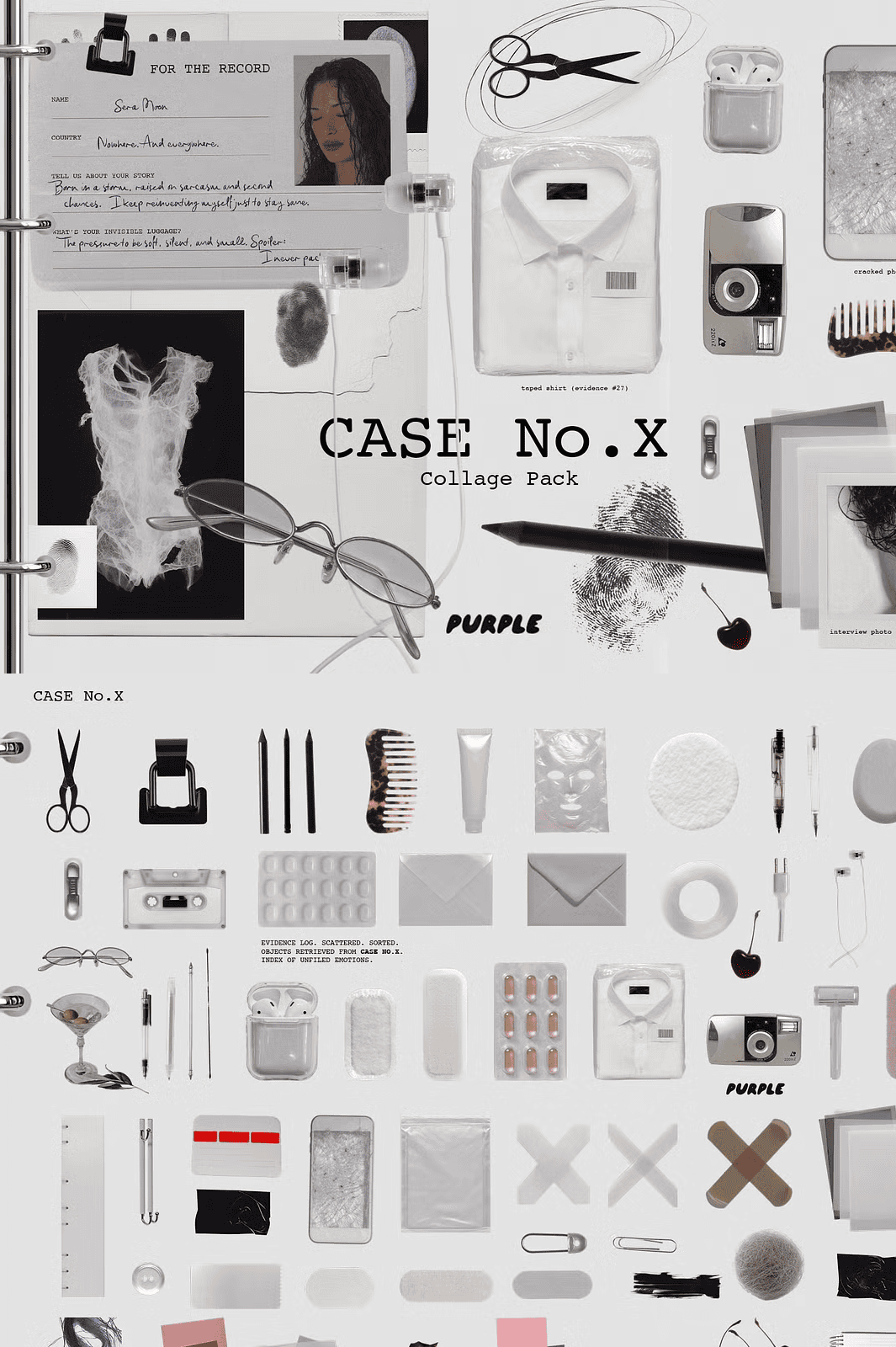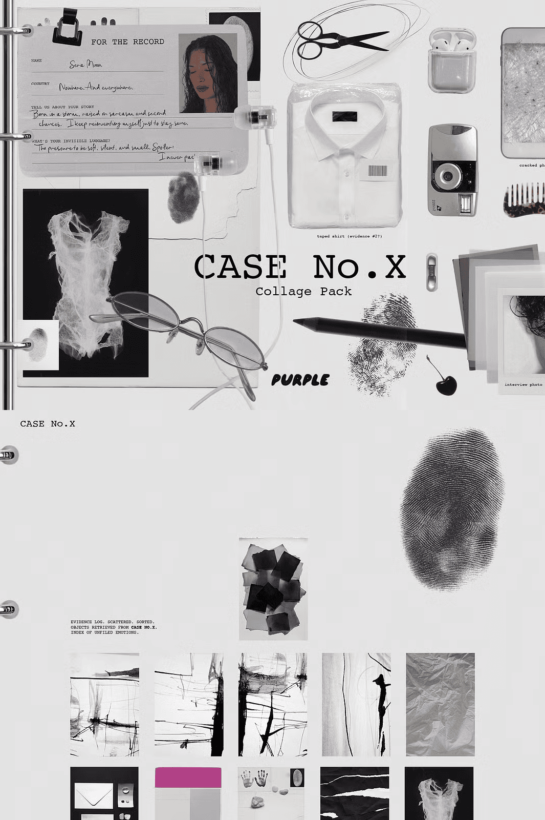 Step into *CASE No.X*, a cryptic collage collection forged from the remnants of an unclosed file, a document from a world just slightly out of phase. This isn’t just a set of design elements it’s a curated fragment of a parallel reality, where logic blurs and meaning lingers in the margins. Every asset feels like it was pulled from a forgotten case file, a fashion sketch from a future that never happened, or a dream that refused to be fully remembered.