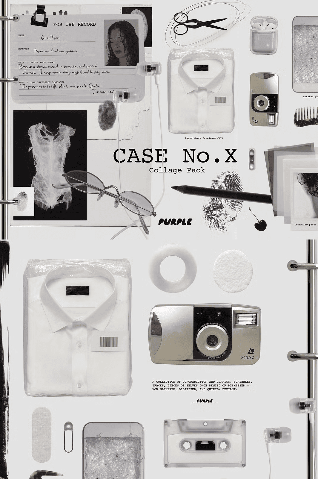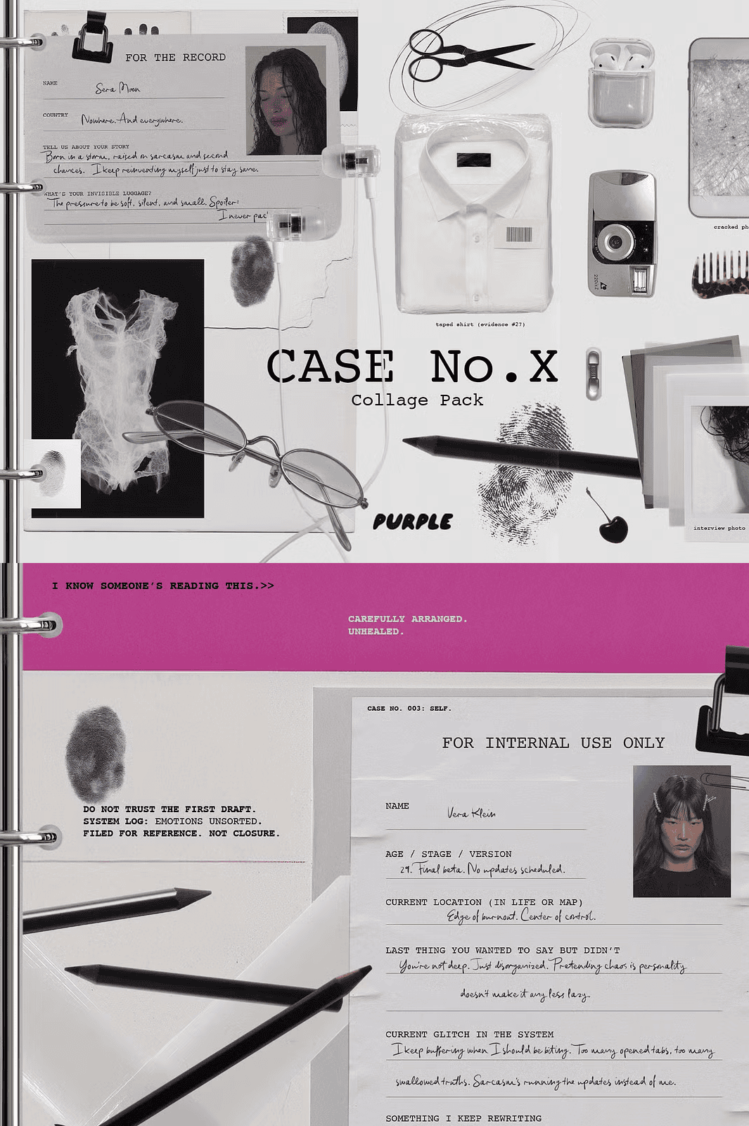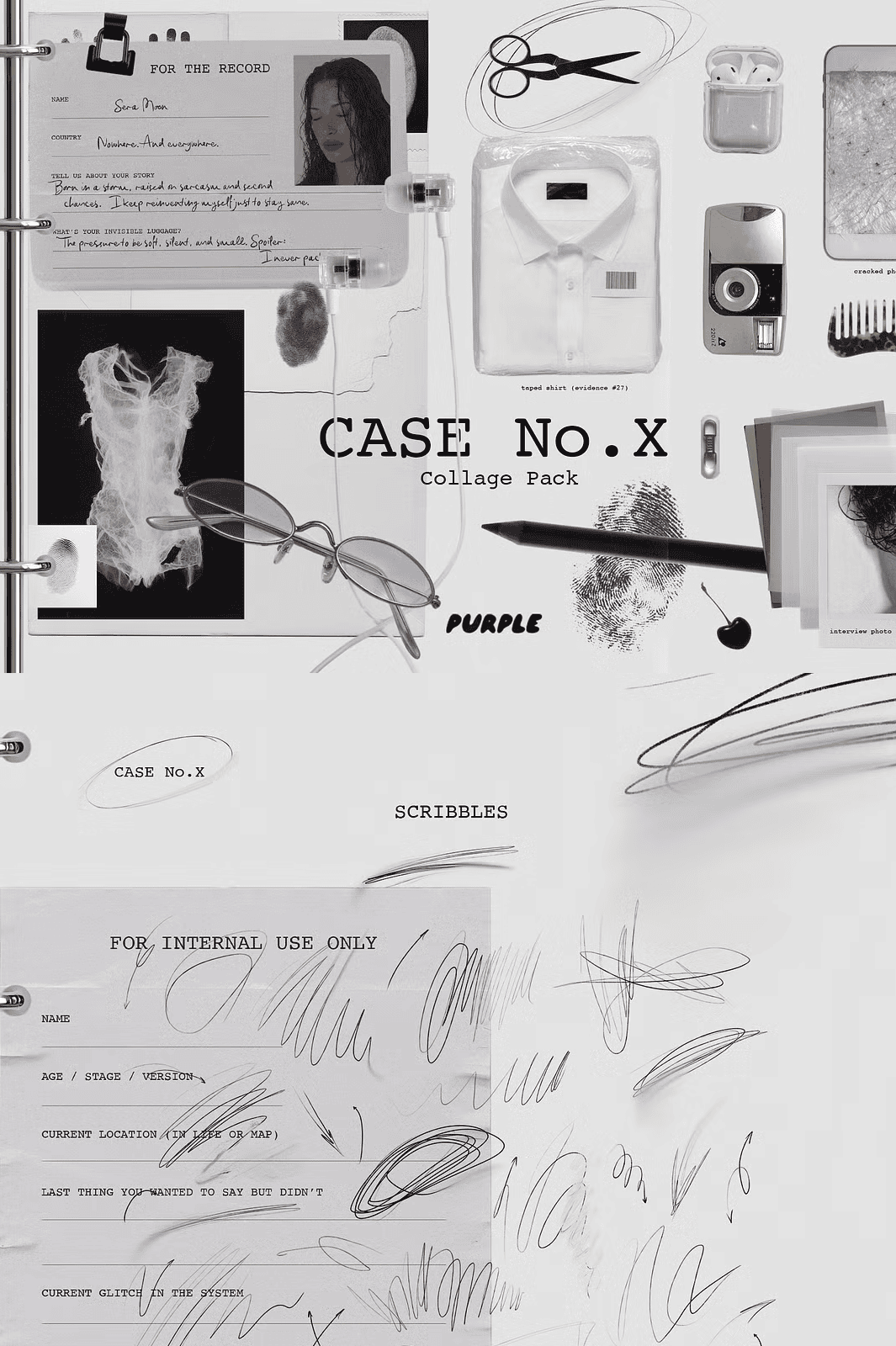 Step into *CASE No.X*, a cryptic collage collection forged from the remnants of an unclosed file, a document from a world just slightly out of phase. This isn’t just a set of design elements it’s a curated fragment of a parallel reality, where logic blurs and meaning lingers in the margins. Every asset feels like it was pulled from a forgotten case file, a fashion sketch from a future that never happened, or a dream that refused to be fully remembered.